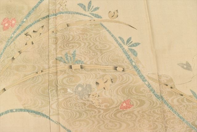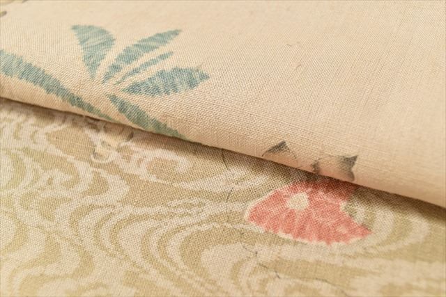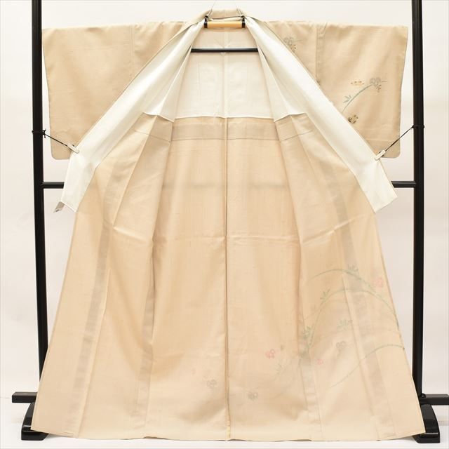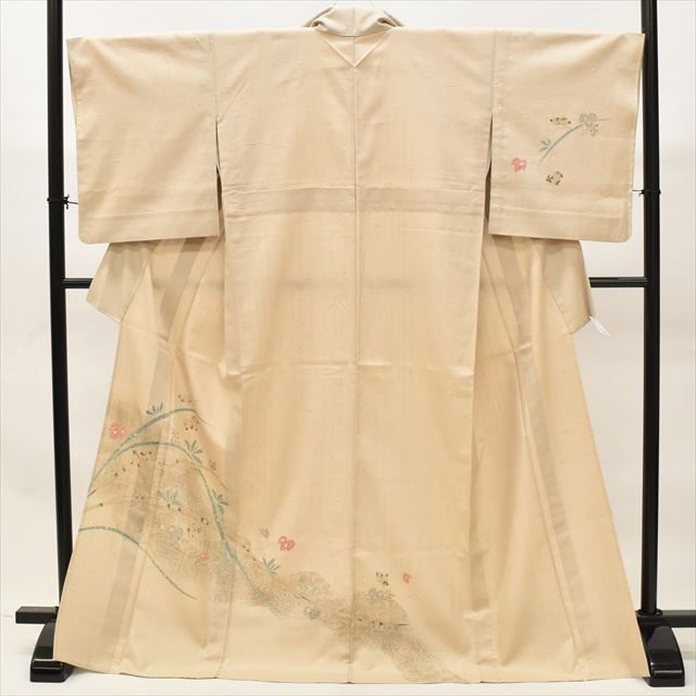 薄茶色に流水に植物文様が施された、お洒落なリサイクル結城紬です。