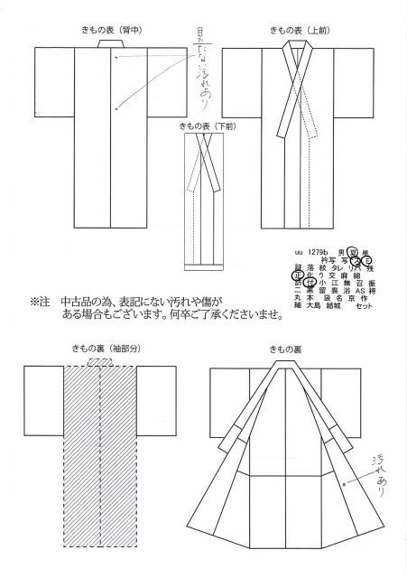 着用時、帯(おはしょり折込)や下前(右前)、衿の折込などで隠れる箇所