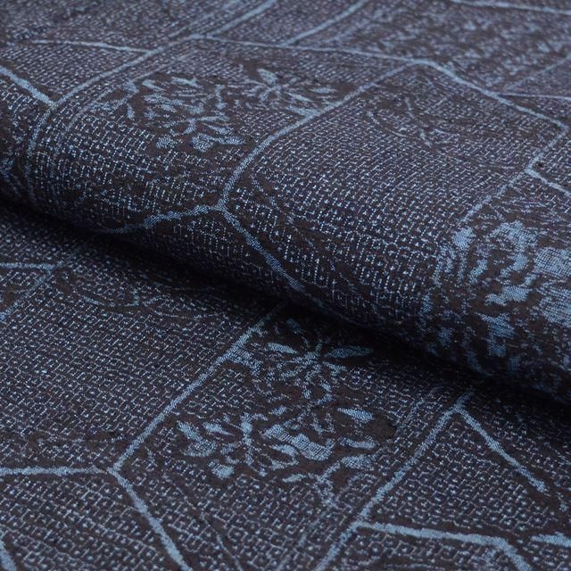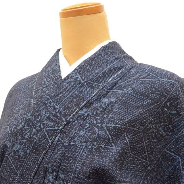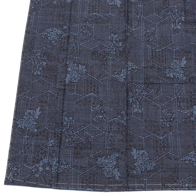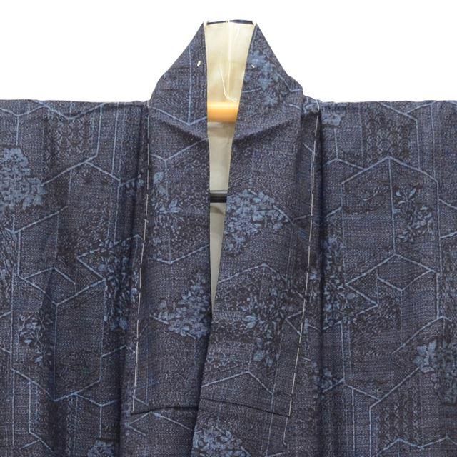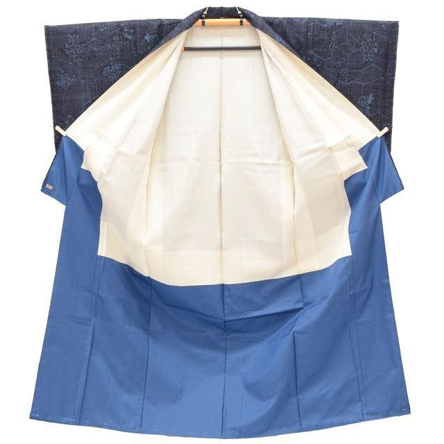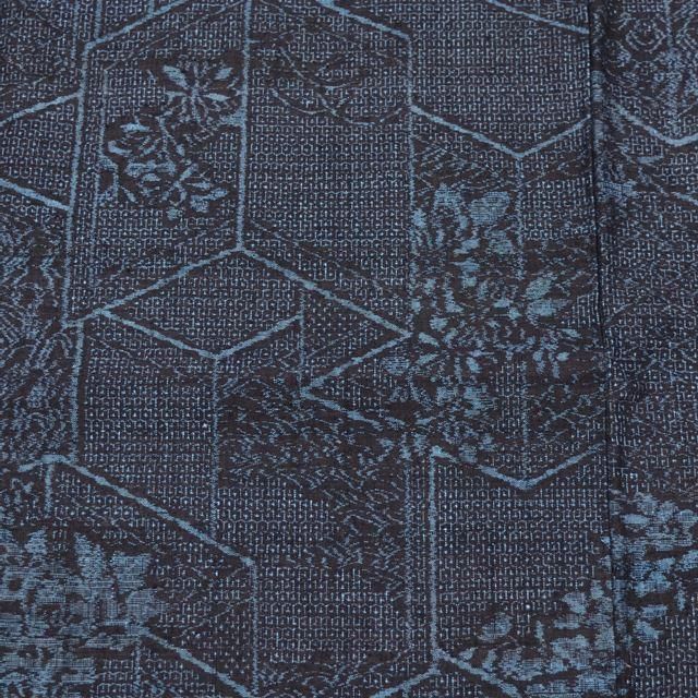 紺色に亀甲絣や花文様が織り込まれた、粋な感じのリサイクル結城紬です。