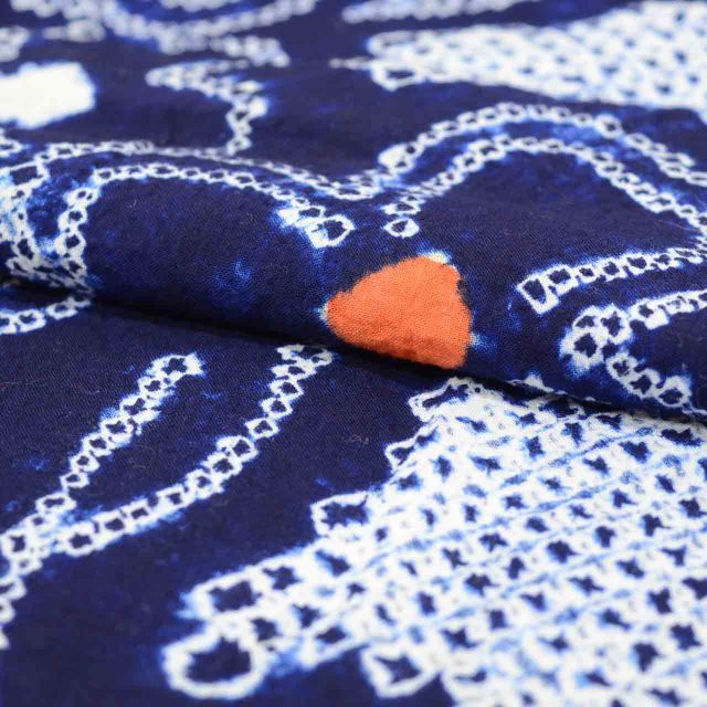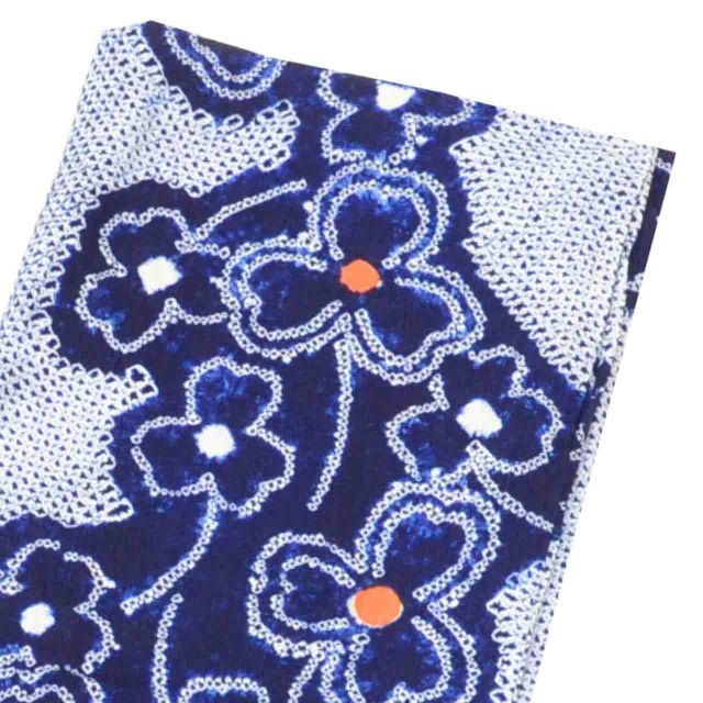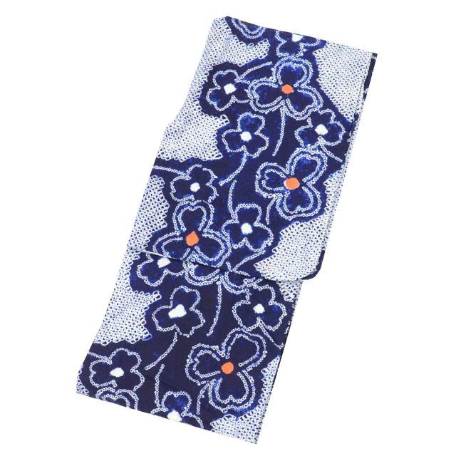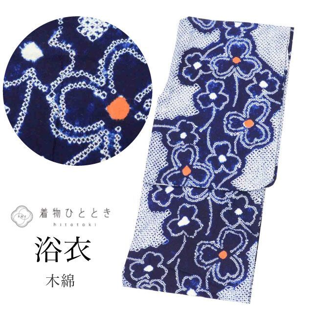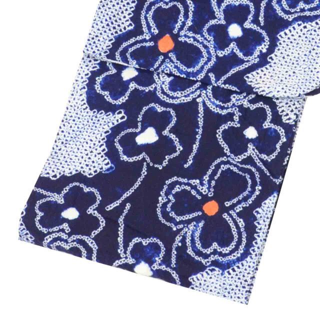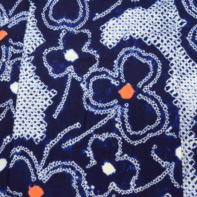 紺色に花文様が施された有松鳴海絞の女性用のリサイクル浴衣です。