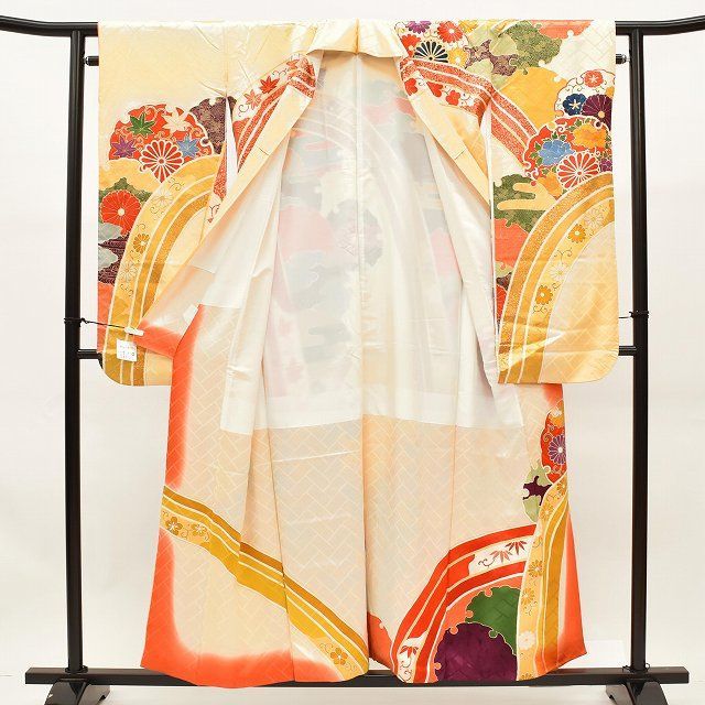 黄色に雪輪に花文様があしらわれた、華やかなリサイクル振袖と長襦袢のセットです。