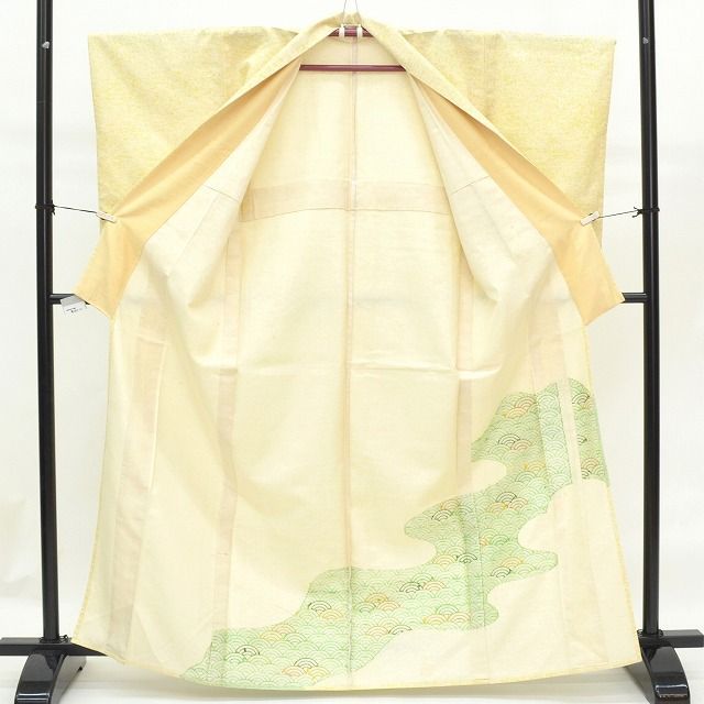 リサイクル単衣牛首紬リサイクル紬正絹仕立て上がりリサイクル着物女性紋付裄61cmS身丈156cmM黄色系青海波特品★★★★mm3560b