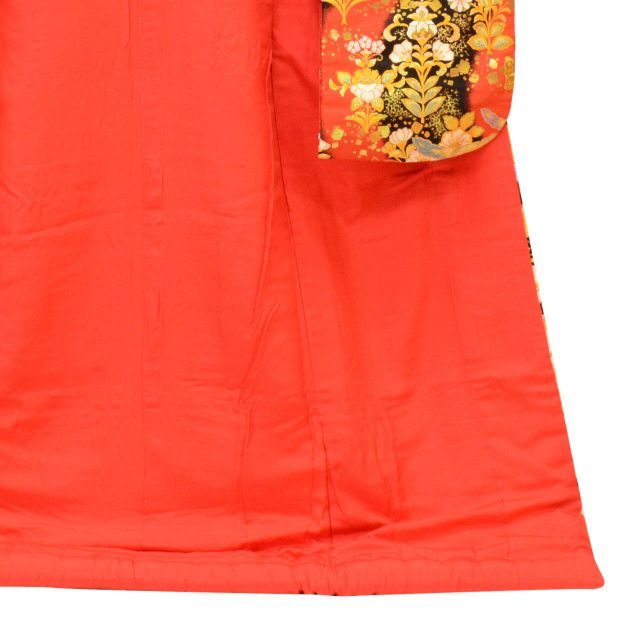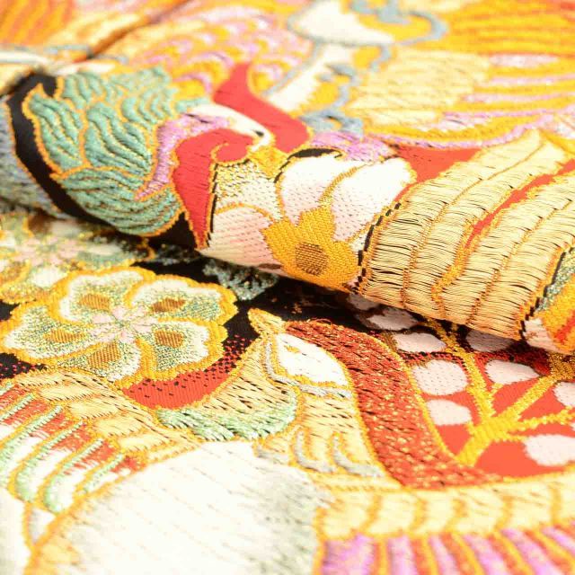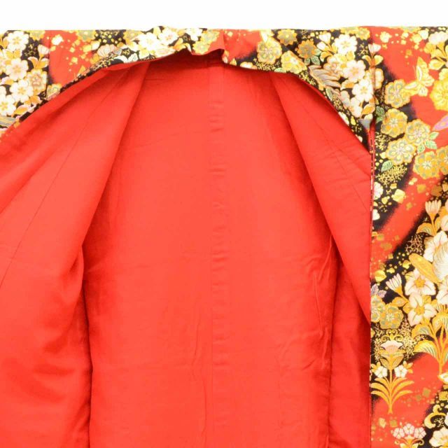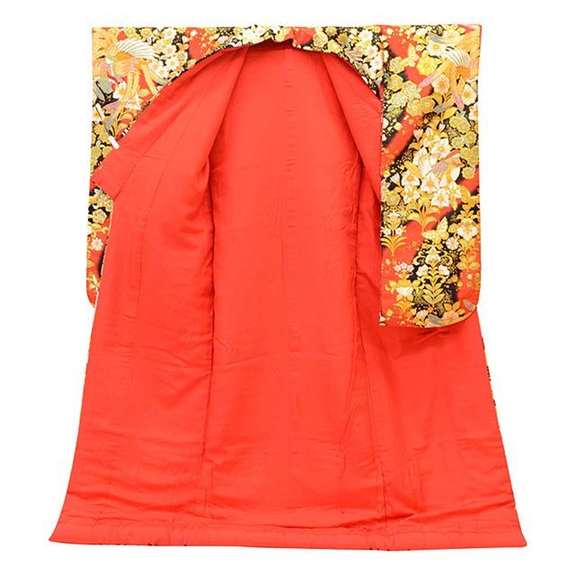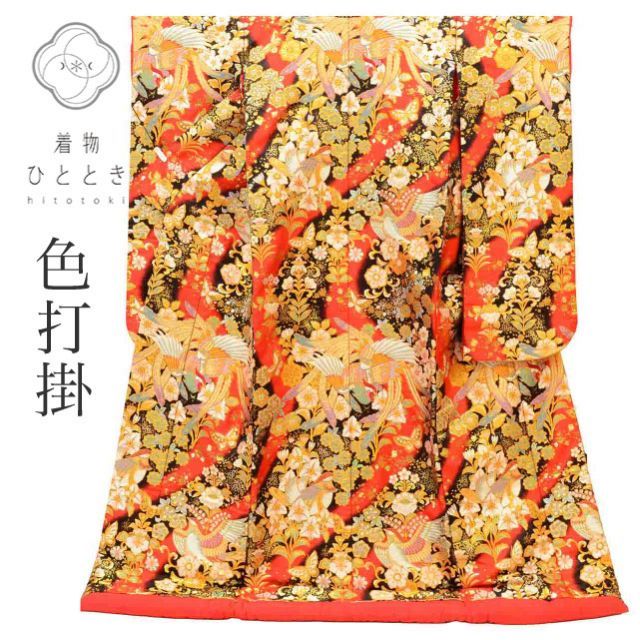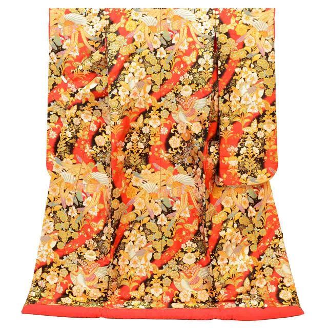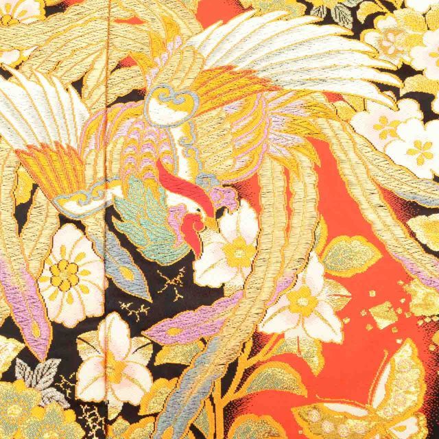 赤や黒色に鳳凰文様があしらわれた、華やかなリサイクルの色打掛です。