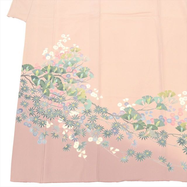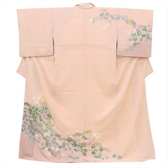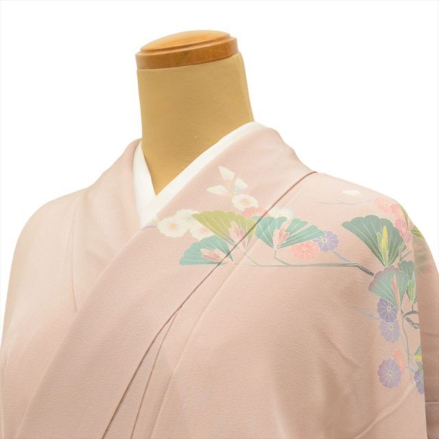 薄淡ピンク色に松や花文様があしらわれた上品さが感じられる訪問着です。