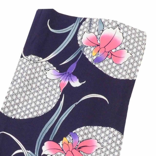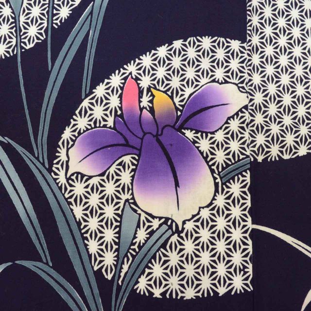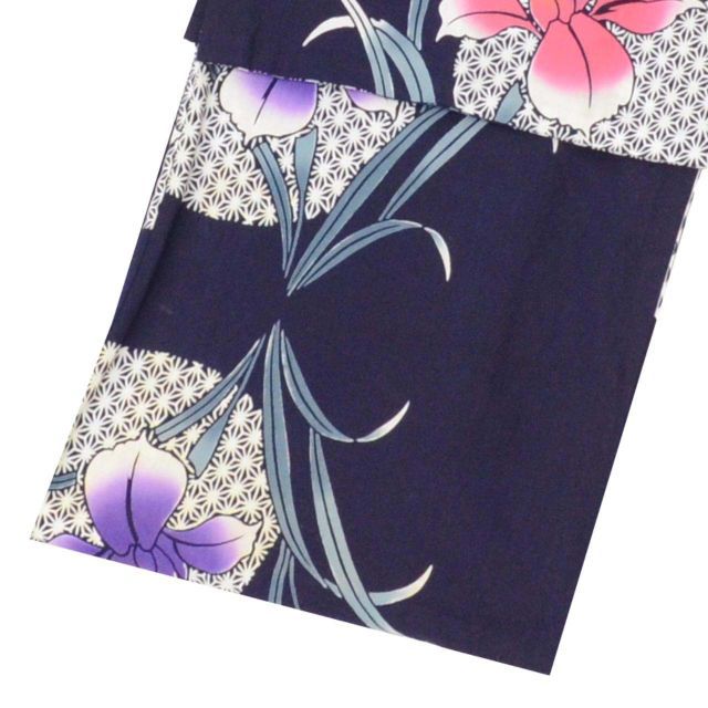 紺色に菖蒲文様が施された可愛らしい女性用のリサイクル浴衣です。