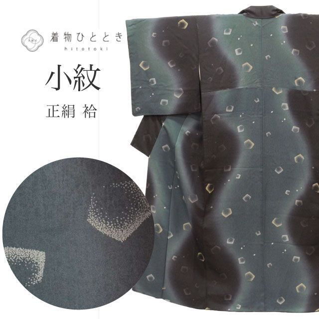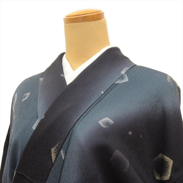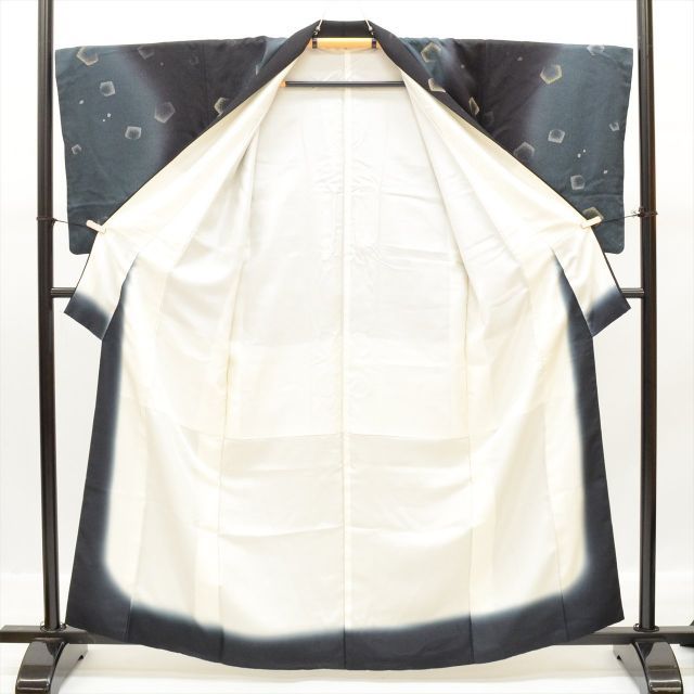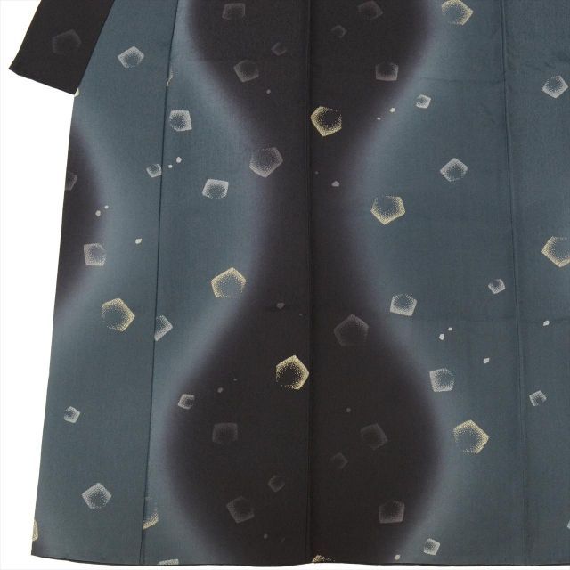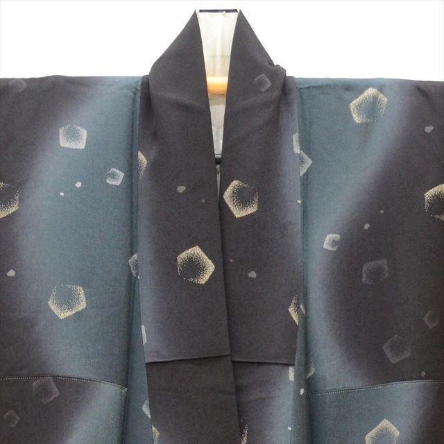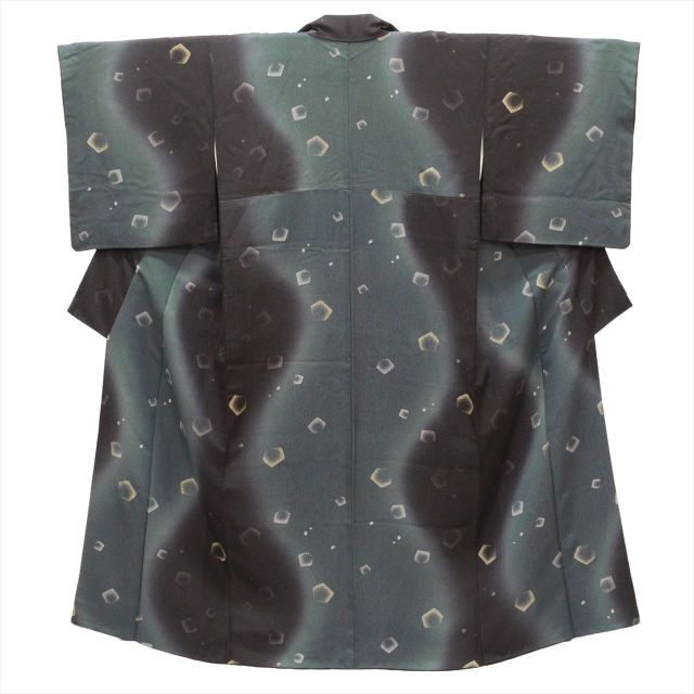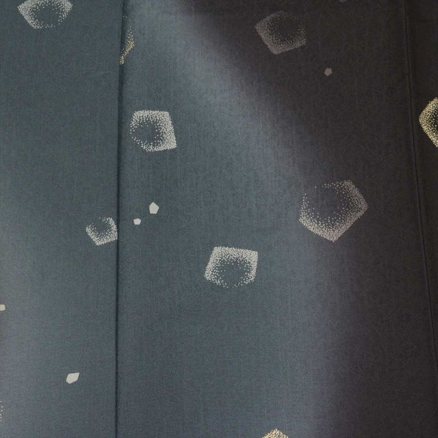 黒やグレー色に幾何学文様があしらわれたモダンな中古の小紋です。