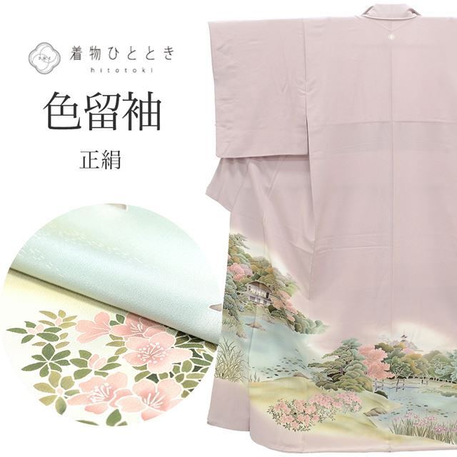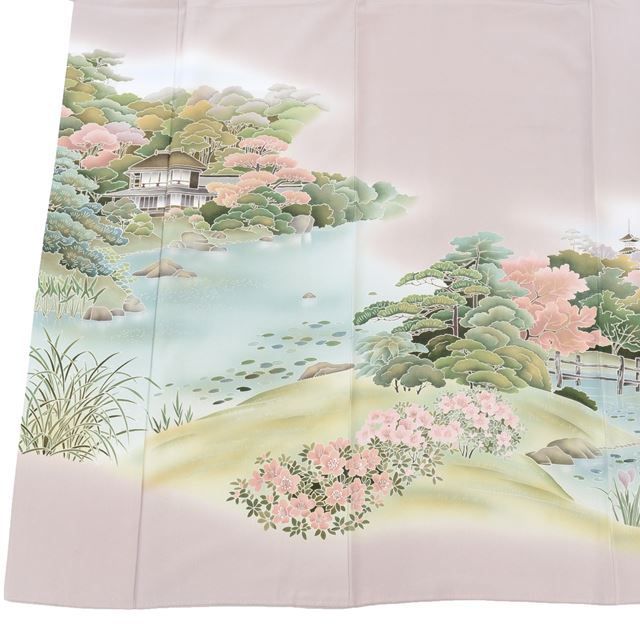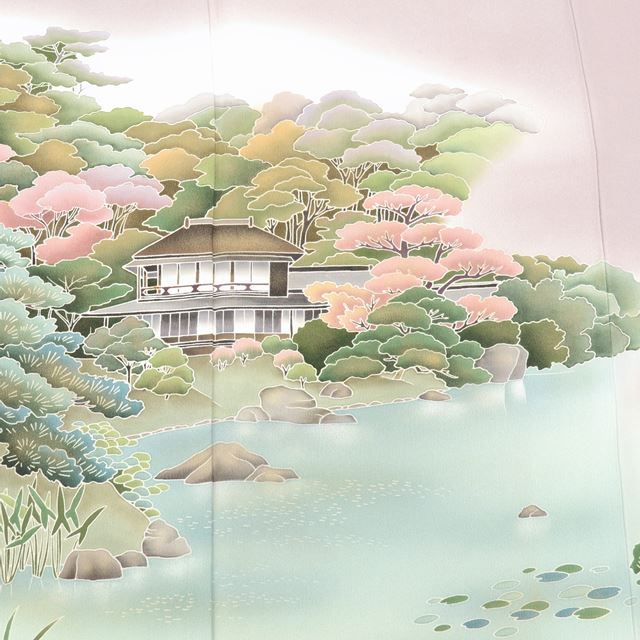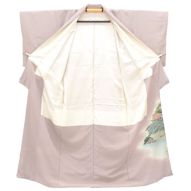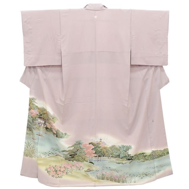 淡い紫色に風景文様が施された、上品なリサイクル色留袖です。