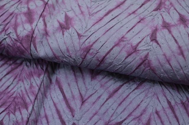 グレーや紫色地に幾何学文様が施された、粋な感じの小紋のお着物です。