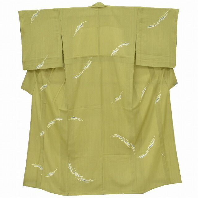 9紬リサイクル着物単衣正絹仕立て上がり美品女性裄67cmL身丈157.5cmM緑色系魚文様特品★★★★pp1255b