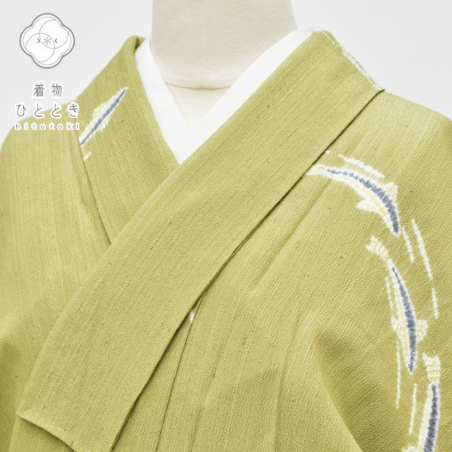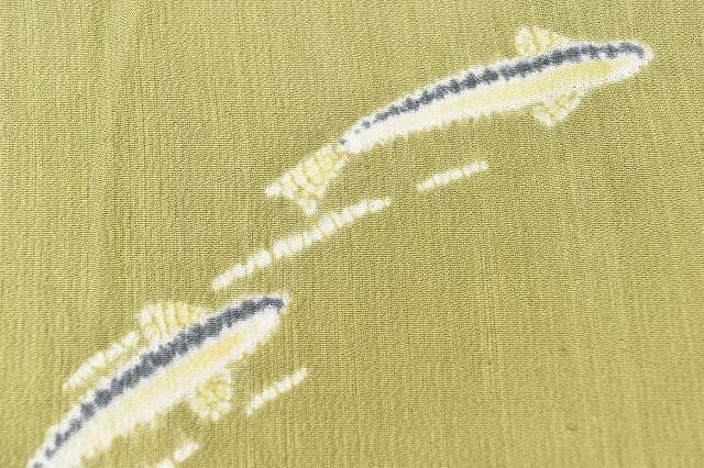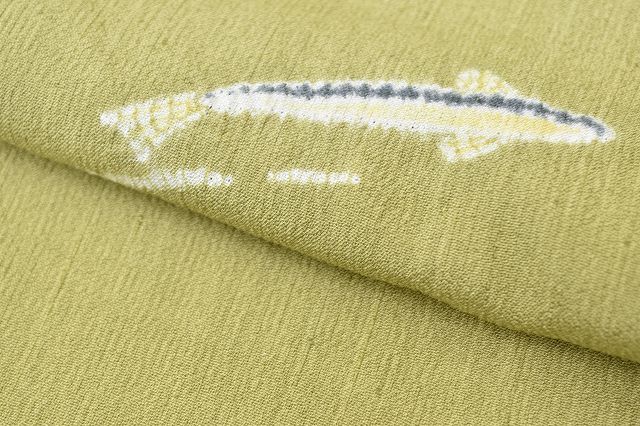 緑色地に魚文様が織り込まれた素朴な味のある紬のお着物です。
