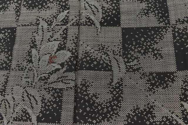茶色地に格子に花文様が織り込まれた、粋な感じの大島紬の着物です。