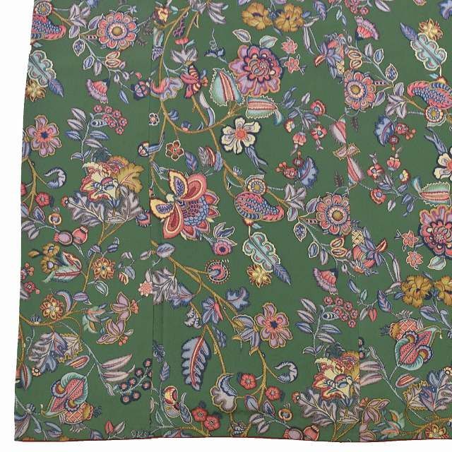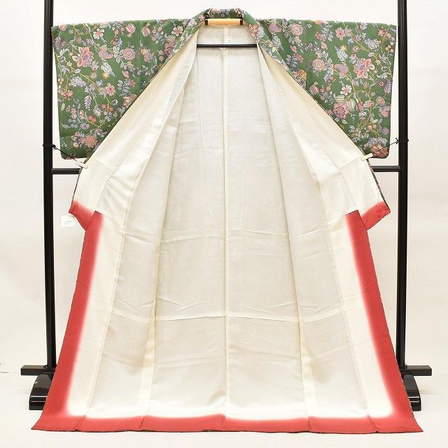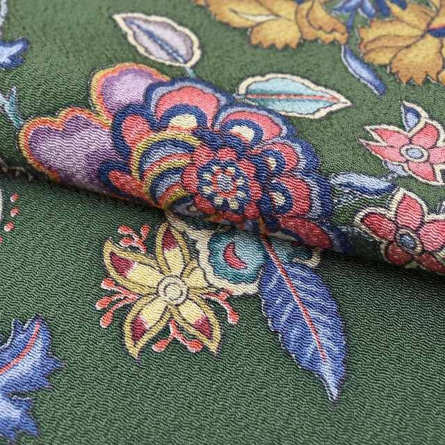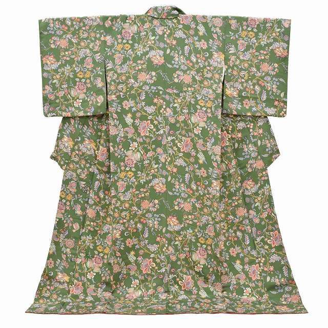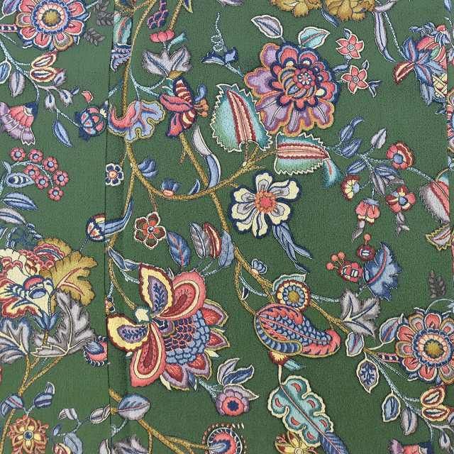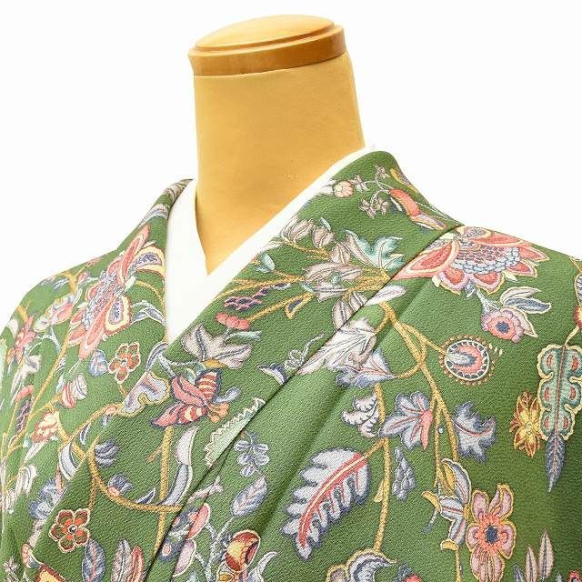 緑色の花文様があしらわれた、モダンなリサイクル小紋です。