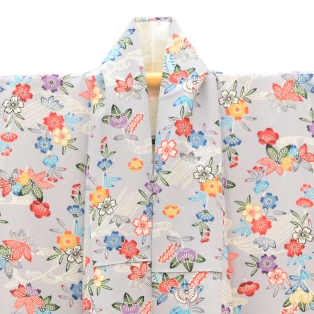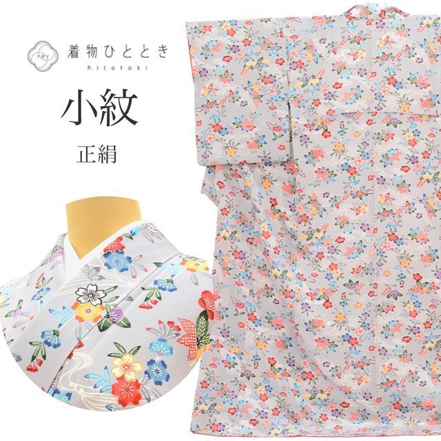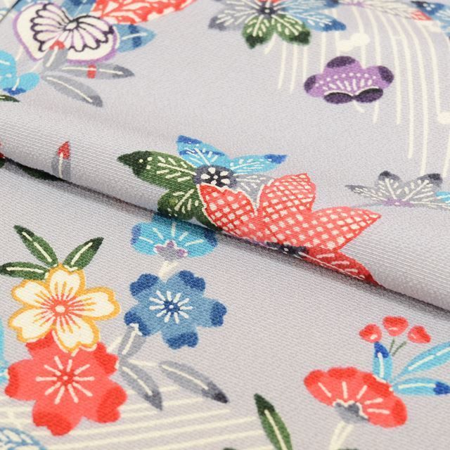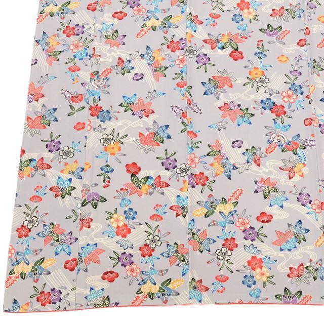 グレー色に花や流水文様があしらわれた、可愛らしいリサイクル小紋です。