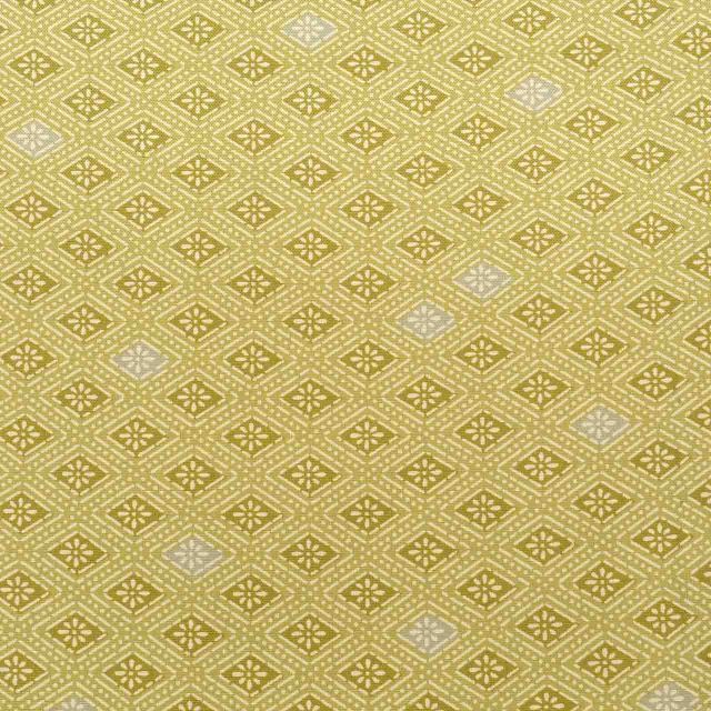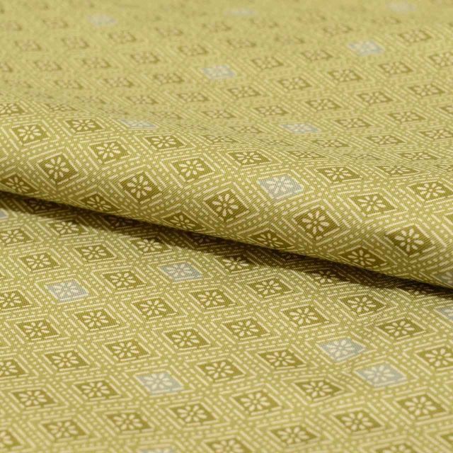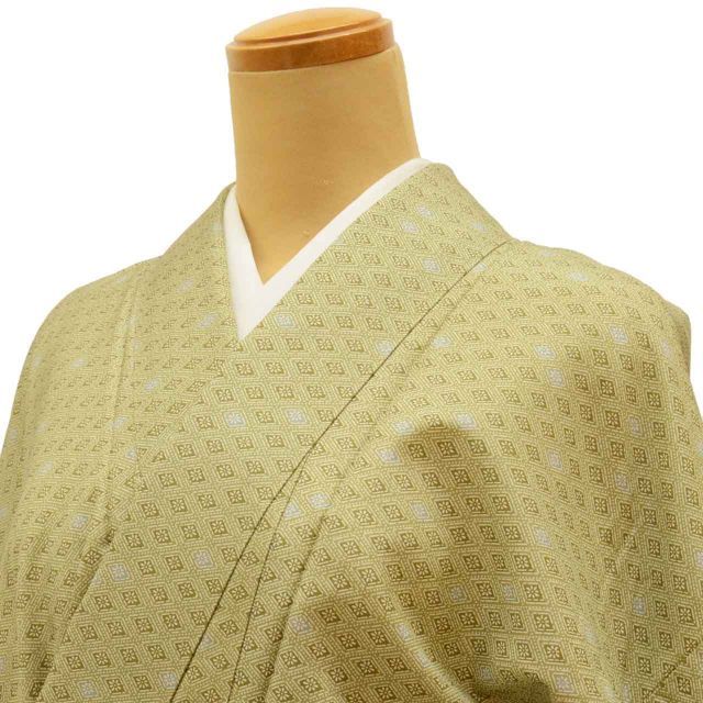 渋い緑色に花菱文様が施されたお洒落なリサイクルの後染めの大島紬です。