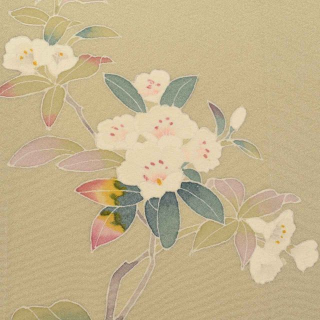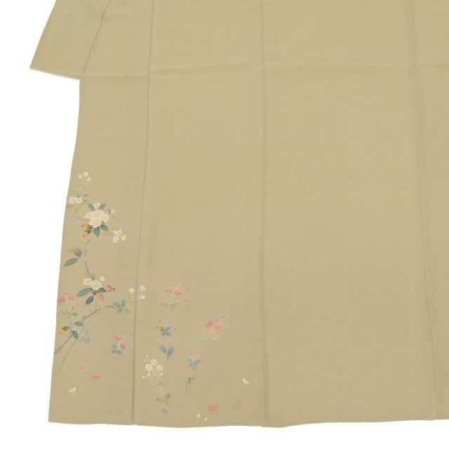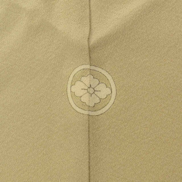 渋い緑色に花文様が施された上品さが感じられる一つ紋付きのリサイクルの付下げです。