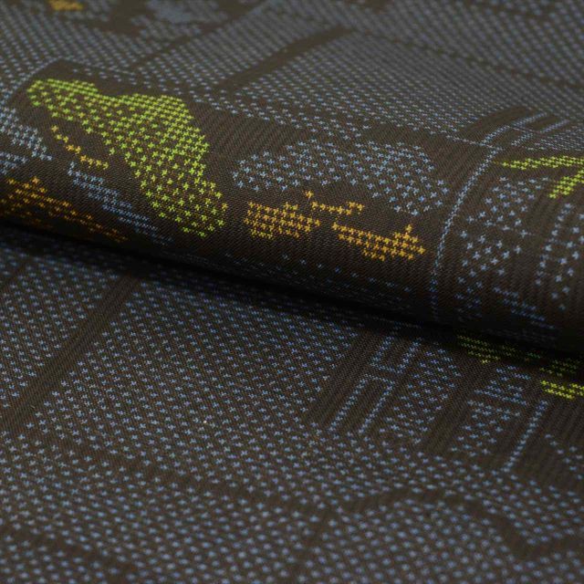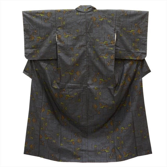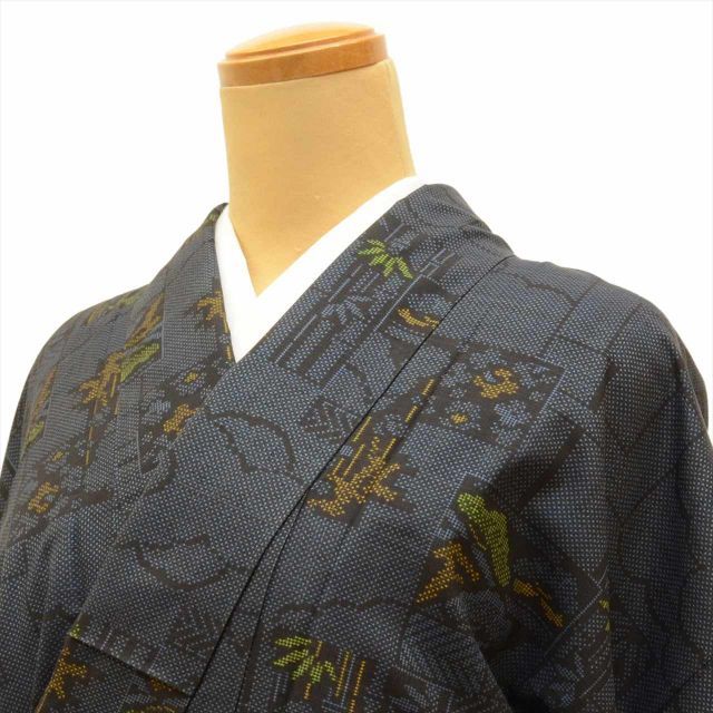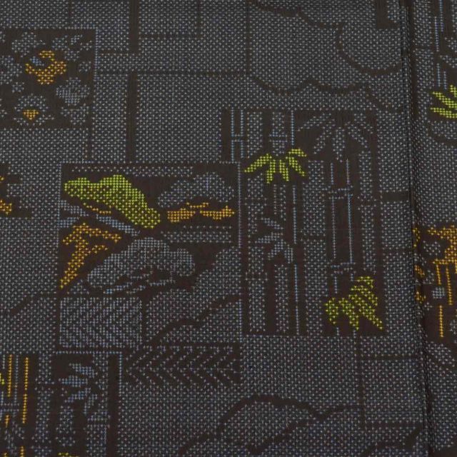 紺色に色紙に竹文様が施されたお洒落な7マルキ・一元式のリサイクル大島紬です。