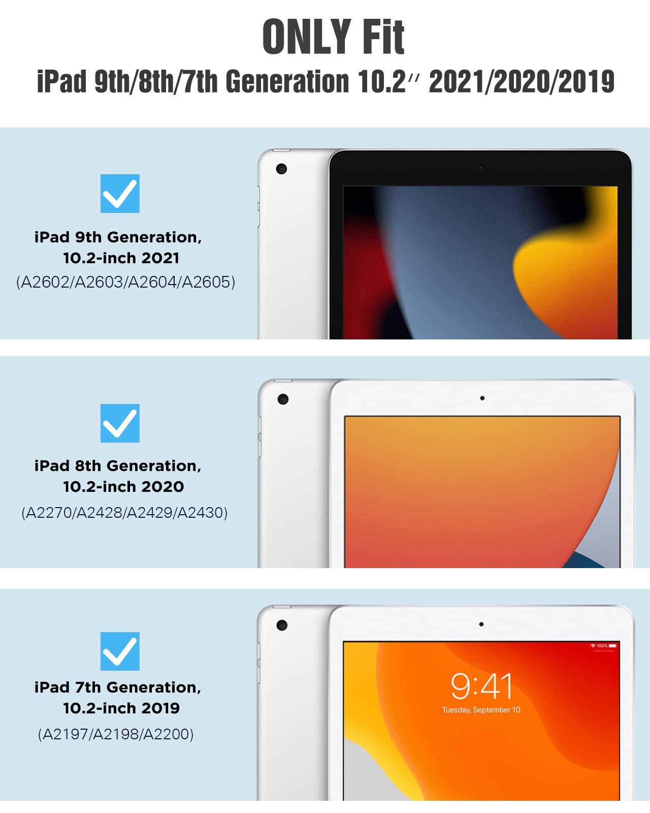 【対応機種】 iPad 10.2インチ 第9世代 2021 (モデル番号:A2602 / A2603 / A2604 / A2605)、iPad 10.2インチ 第8世代 2020 (モデル番号:A2270 / A2428 / A2429 / A2430)、iPad 10.2インチ 第7世代 2019 (モデル番号:A2197 / A2198 / A2200) 専用ケース。(ご注意:他のモデルには適用しません。購入する前にタブレットの機種を確認してください。)