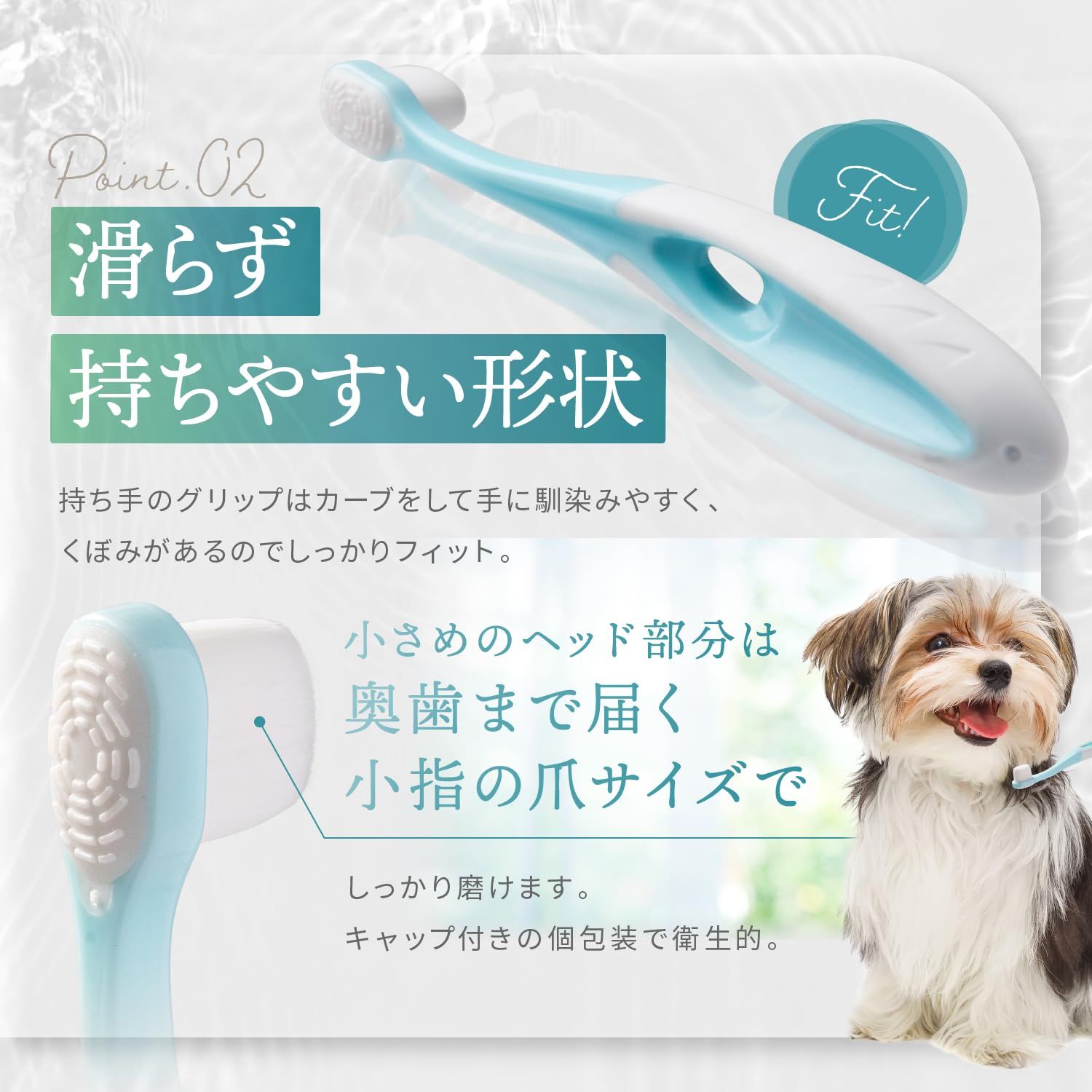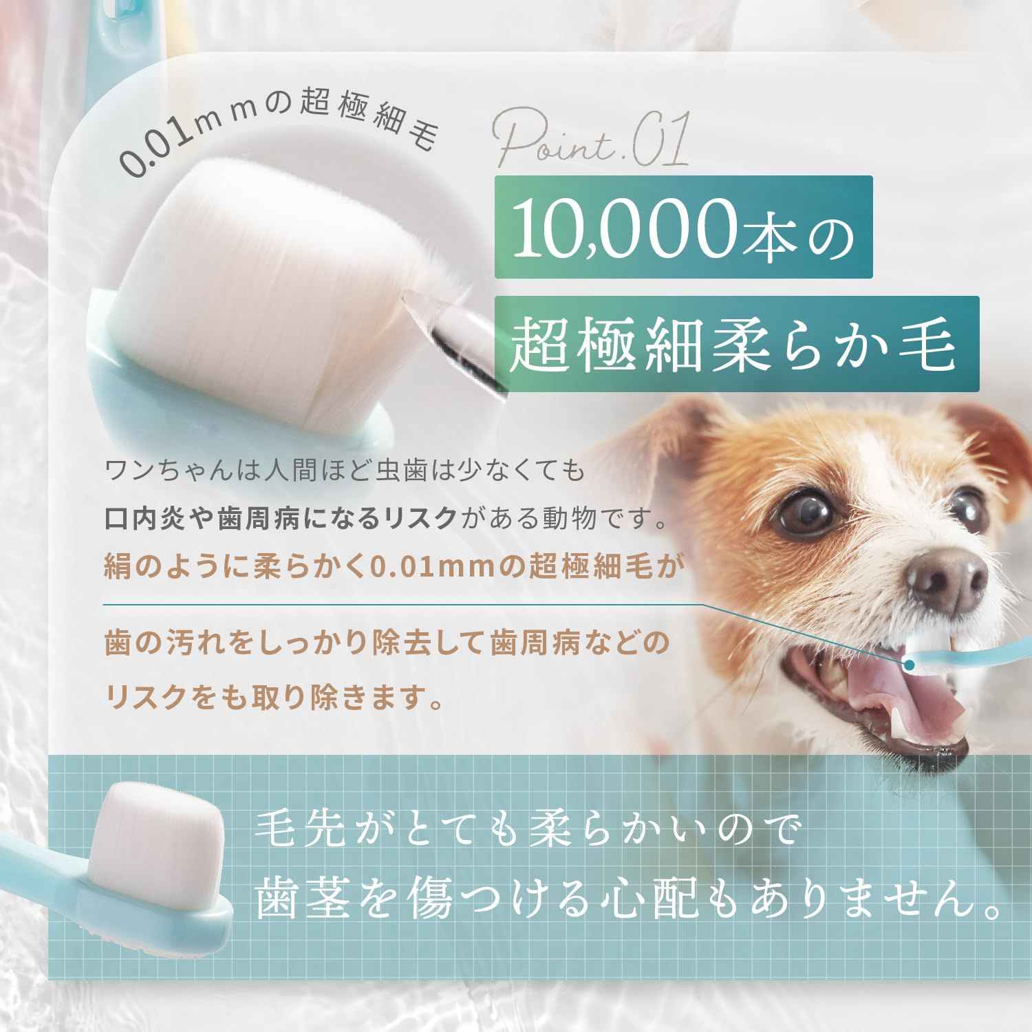 【こだわり】1本1本に柔らかい超極細ナノ粒子を練り込み、外側もコーティングを施しており、抗菌・抗ウイルス・消臭効果があります。口まわりに触れることを嫌がるペットもいますが、LeLante 犬歯ブラシ小型犬は10,000本の柔らかい0.01mm超極細毛で、歯と歯茎をしっかり包み込むように磨ける。歯に対するダメージをかなり減らすことができ、歯に敏感な痛みを減らし、歯を効率よくきれいにすることができます。小型犬の口に合わせた小さいヘッドで、奥歯も磨きやすいです。
