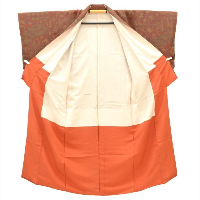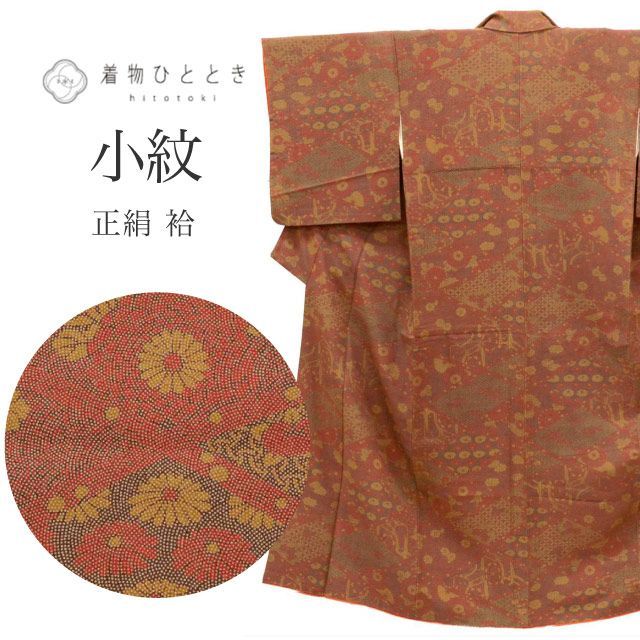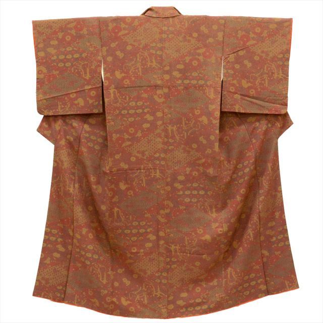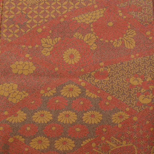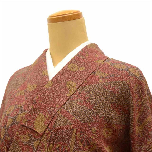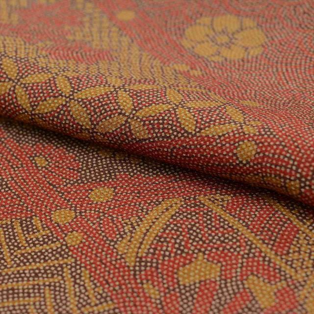 赤茶色に菱に植物文様があしらわれたお洒落な小紋です。