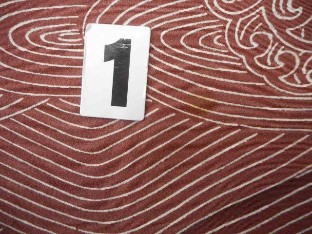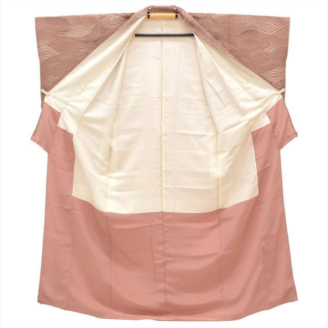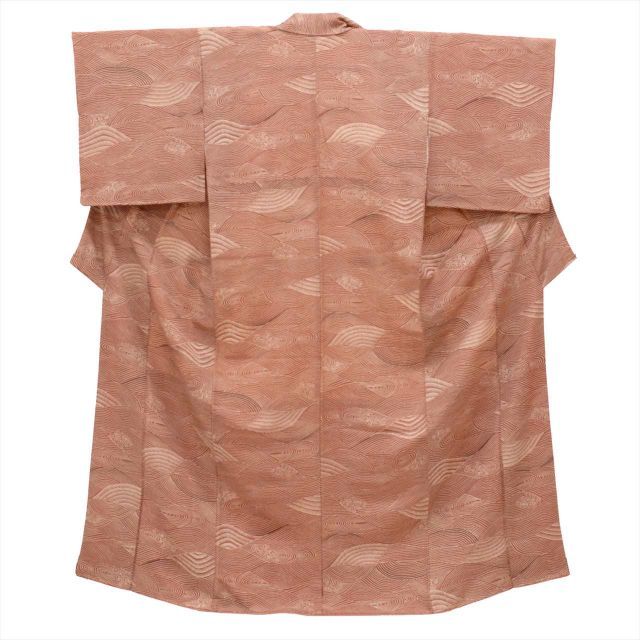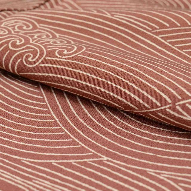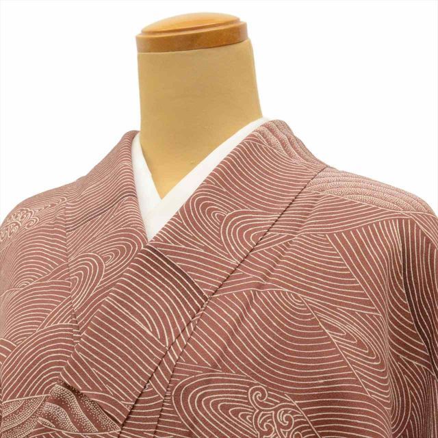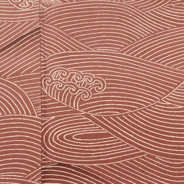 赤茶色に波文様があしらわれたお洒落なリサイクル小紋です。