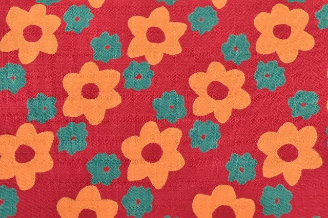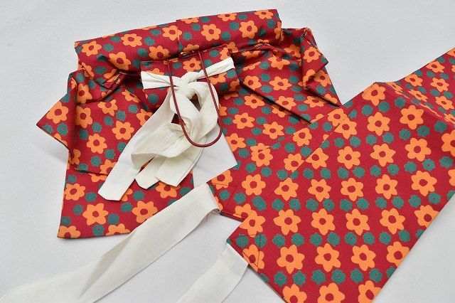 赤色に花文様が施された子供用のかわいらしい作り帯です。