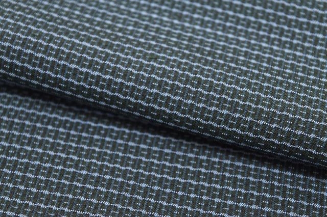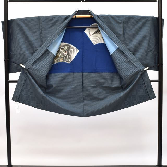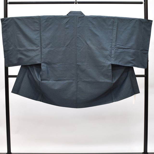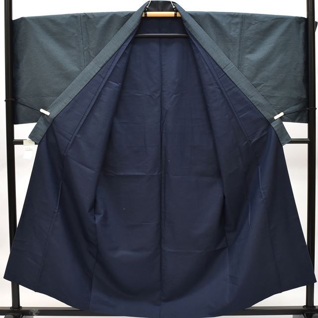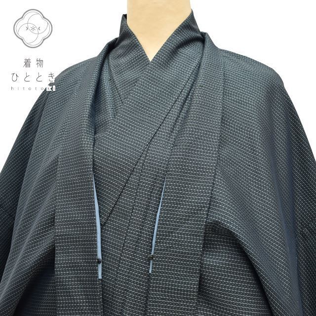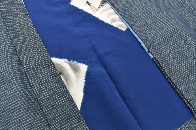 紺色に緯絣文様が施された粋な感じの男物の着物と羽織です。