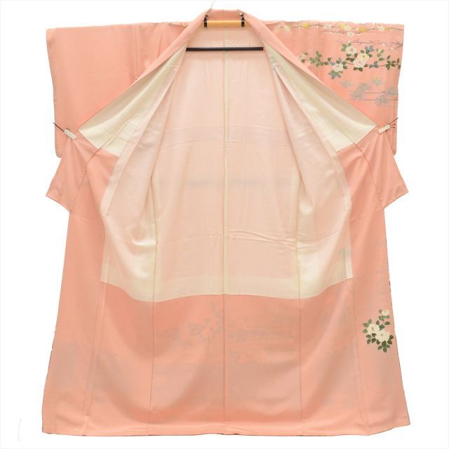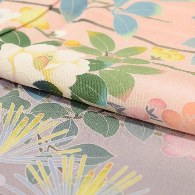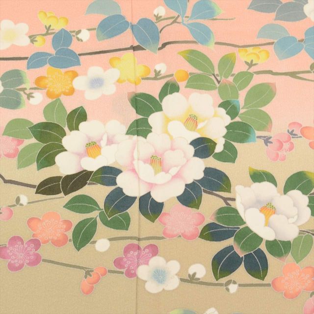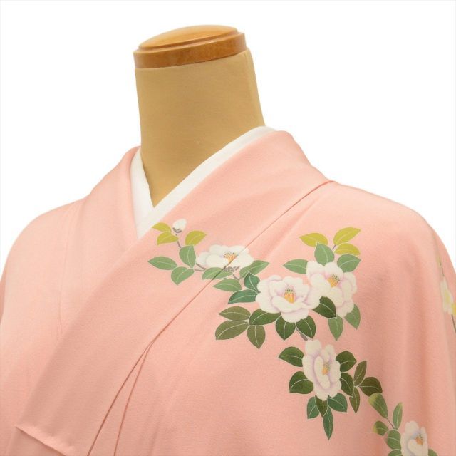ピンク色に椿文様があしらわれた上品さが感じられるリサイクル訪問着です。