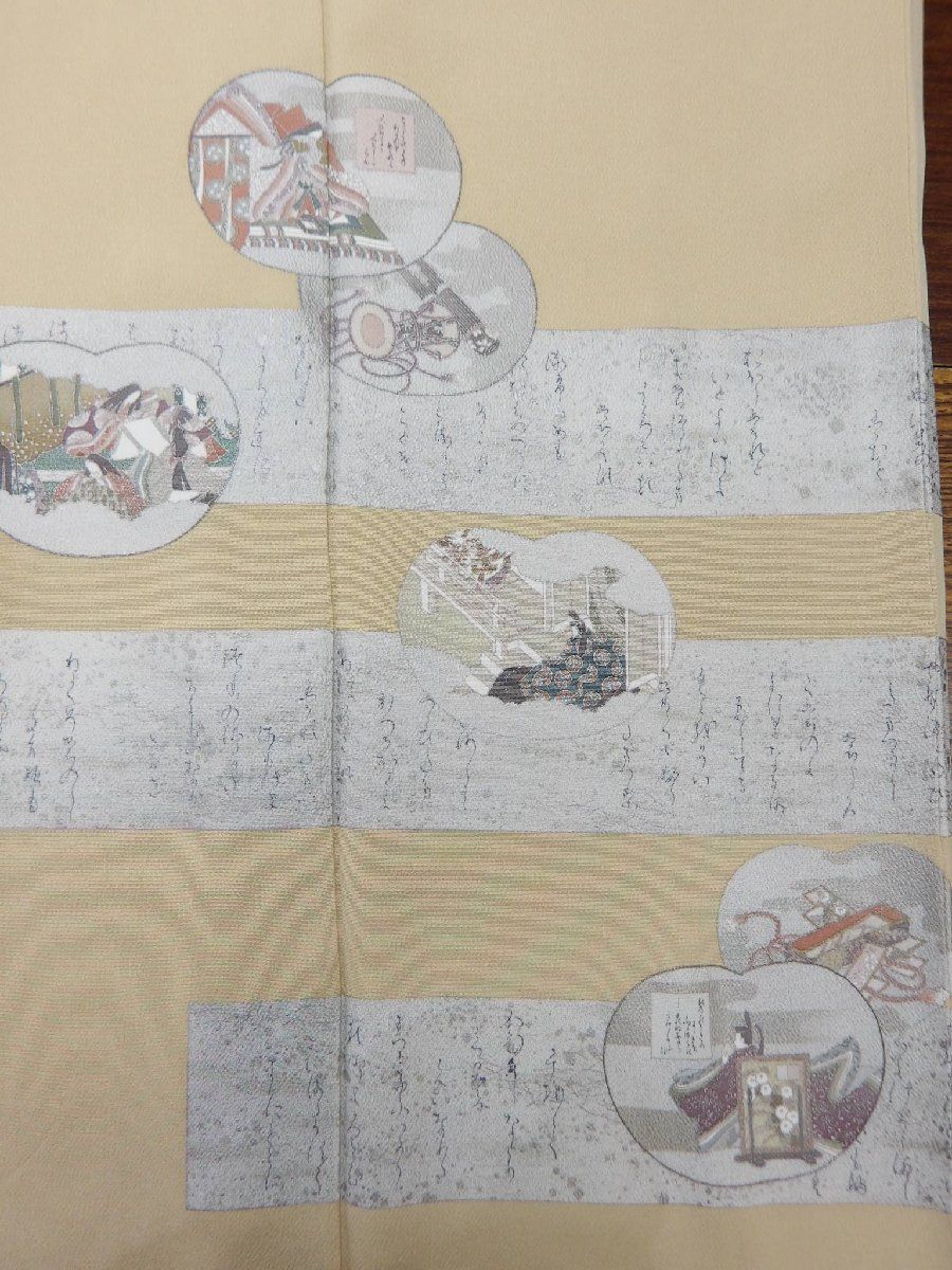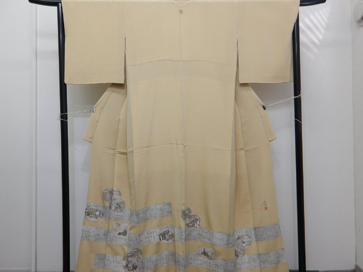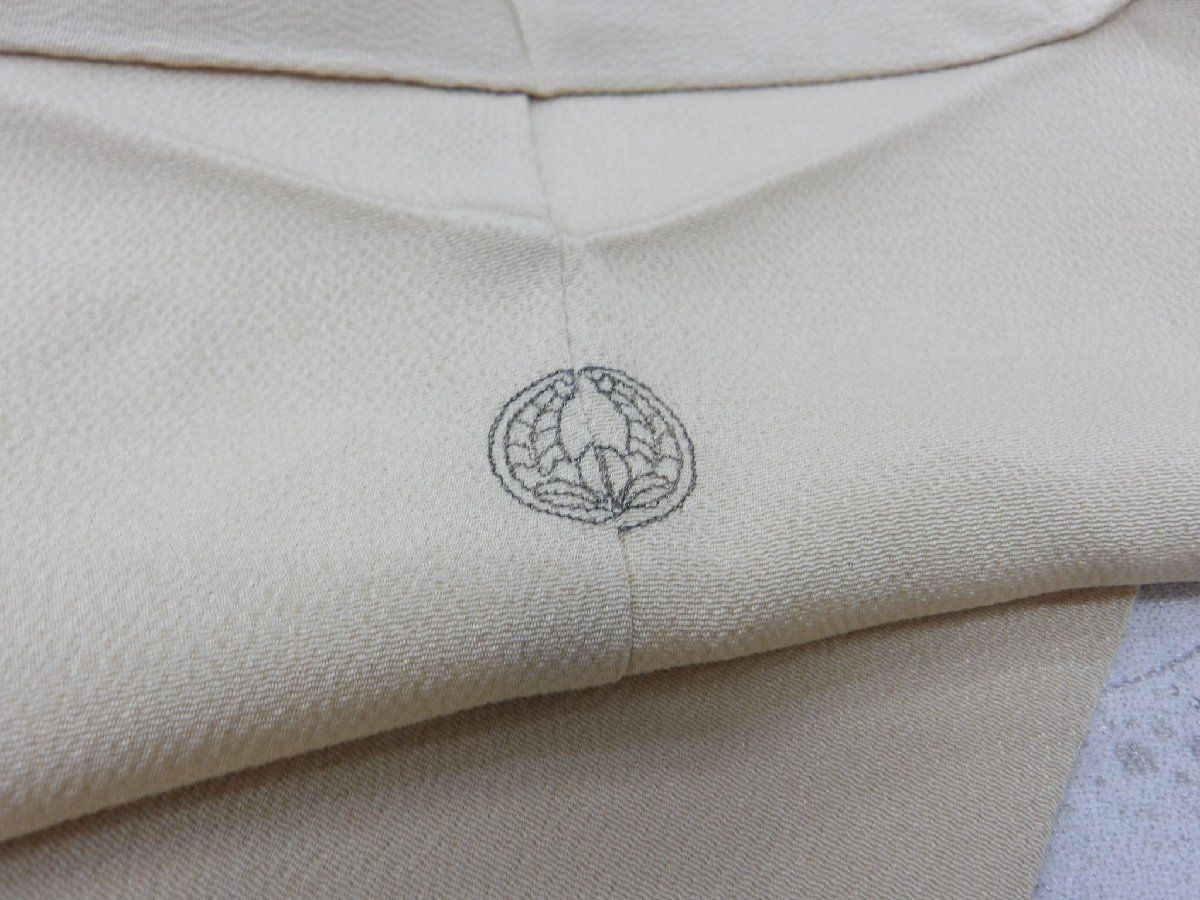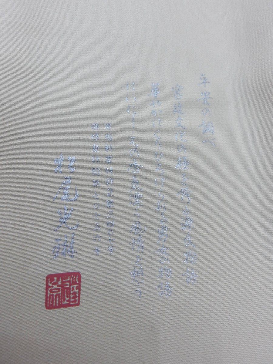 衿は広衿で下前おくみに落款入り、刺繍一つ紋入りです。
