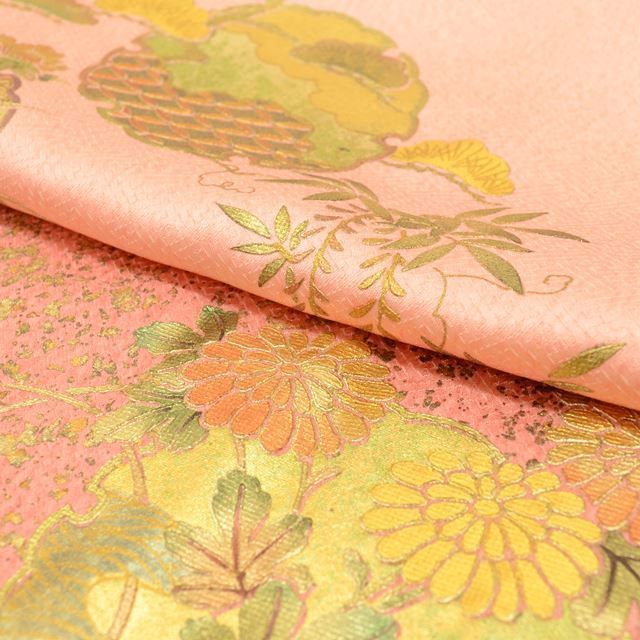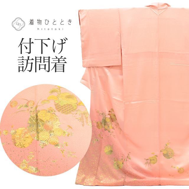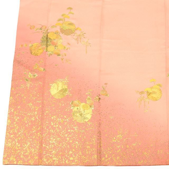 オレンジ色に雪輪に花文様があしらわれ、華やかさが感じられるリサイクル付下げ訪問着です。
