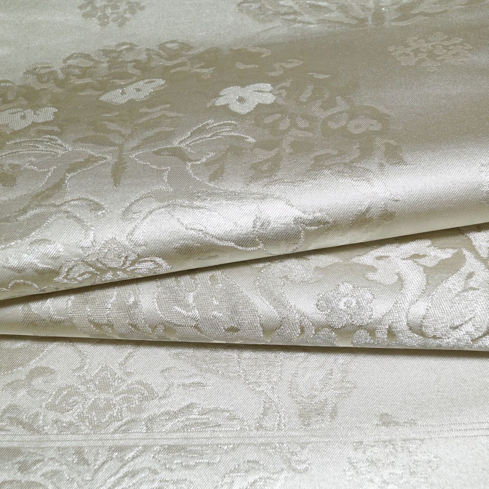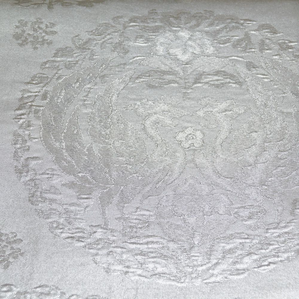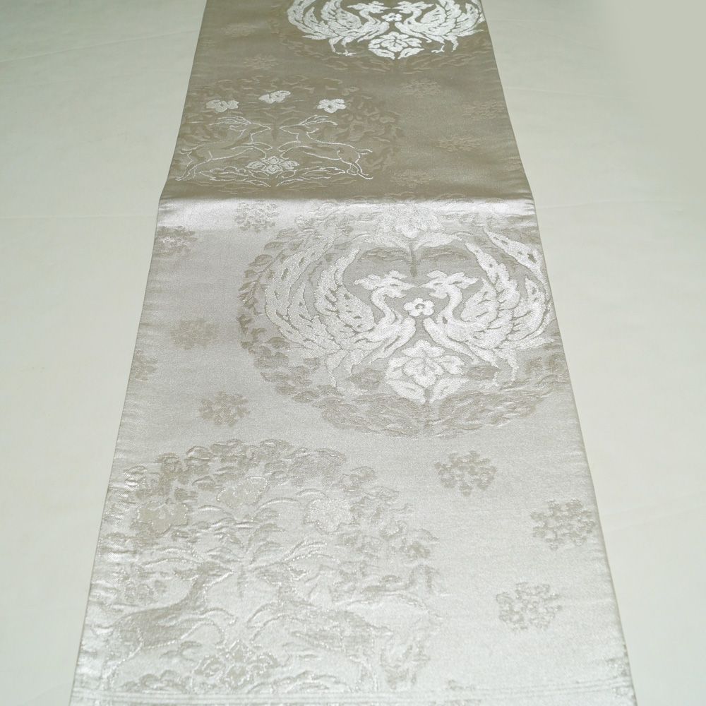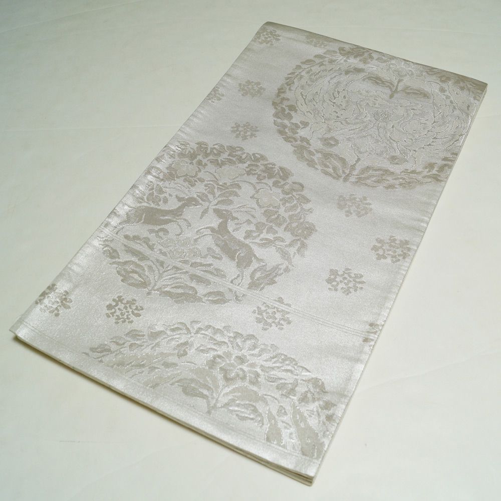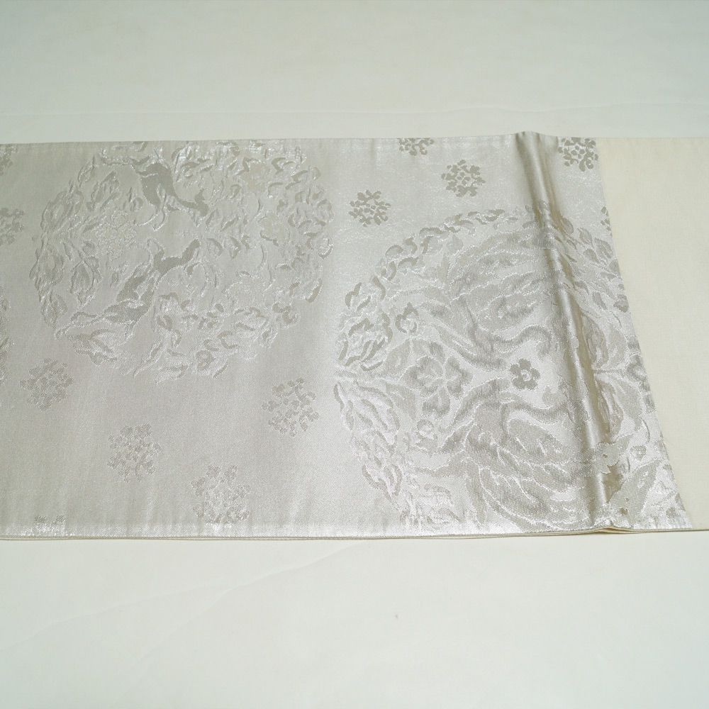 シックな銀色系の地に鳳凰丸紋や鹿紋などの模様が織られた袋帯です。