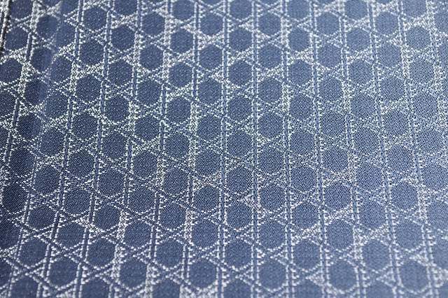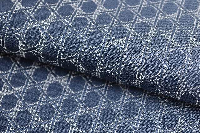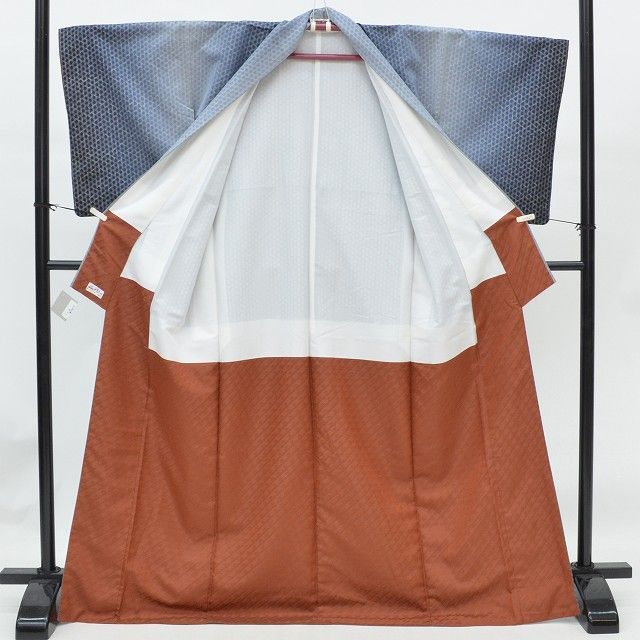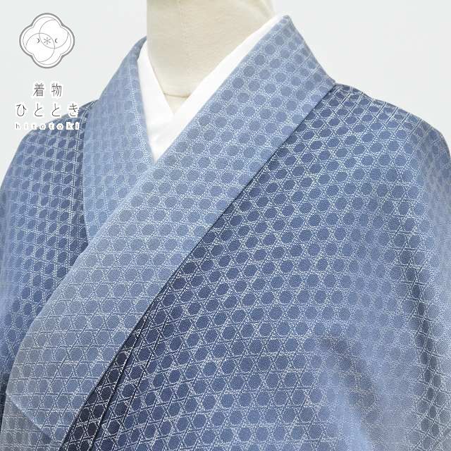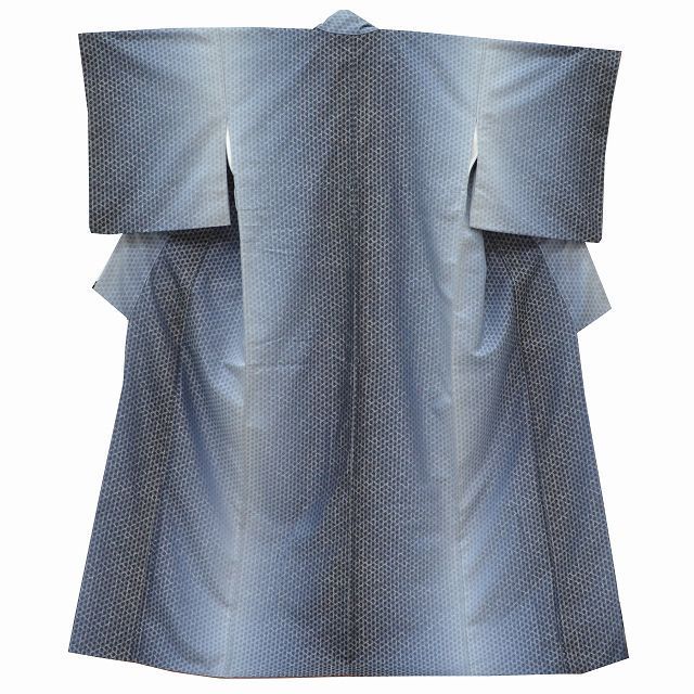 青グラデーション色地に籠目文様が施された粋な感じの小紋のお着物です。