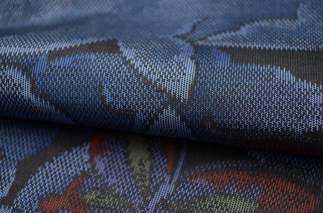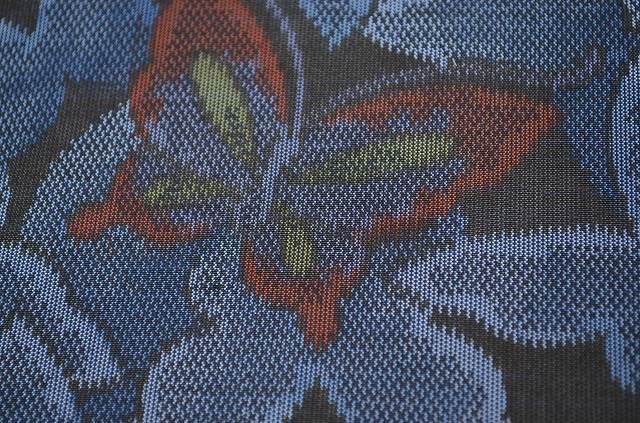 黒色地に蝶文様が施されたお洒落な大島紬のお着物です。