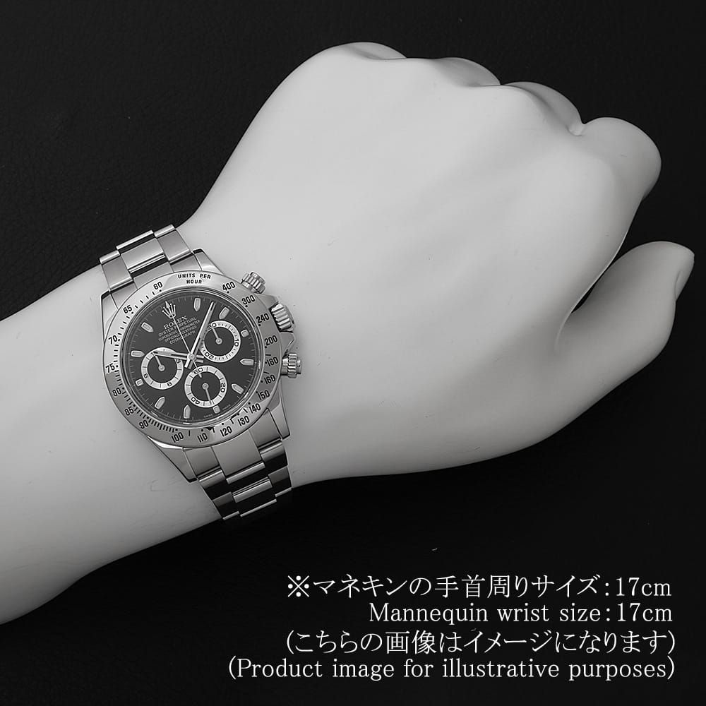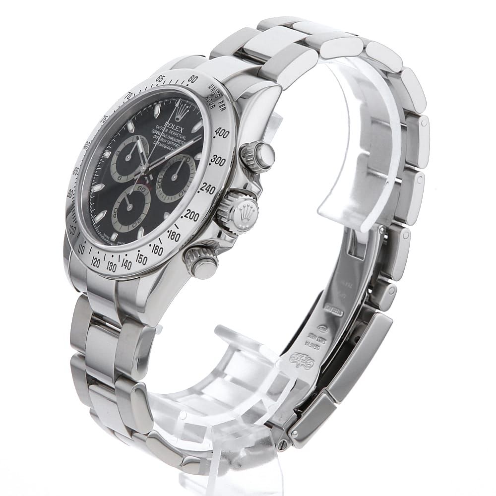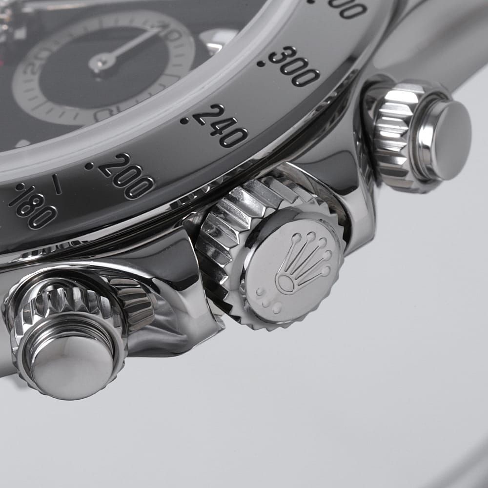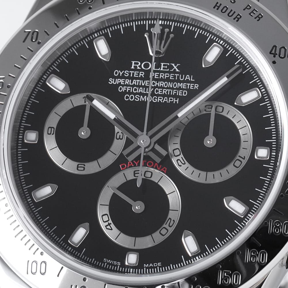 ■モデル情報:生産終了した今なお、時計ファンから熱い支持を得続けるデイトナRef.116520。ロレックス初の完全自社製クロノグラフとなるCal.4130を搭載した、同社にとって意義深いモデルでもあります。さらに、2000年〜2016年の製造期間の中で随所にブラッシュアップが加えられており、高い安定性や耐久性、実用性を獲得しました。ステンレスで形成されたベゼルが精悍な顔立ちで、全体をスタイリッシュに引き締めます。パワーリザーブ約72時間。100m防水。