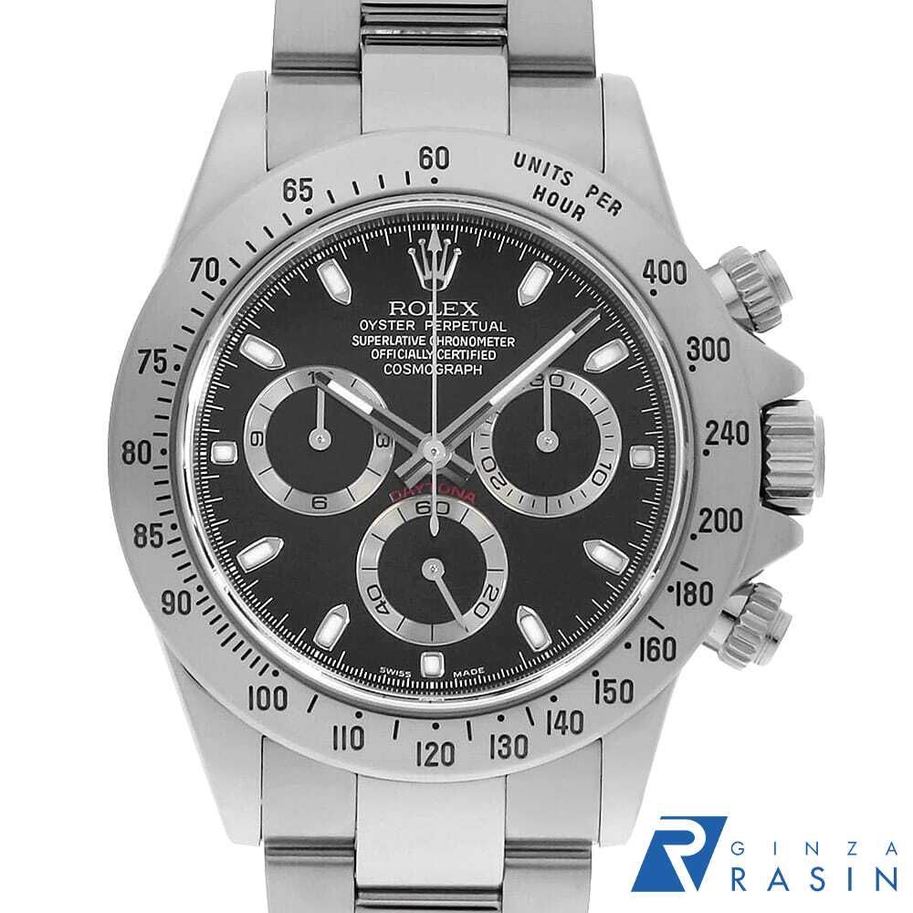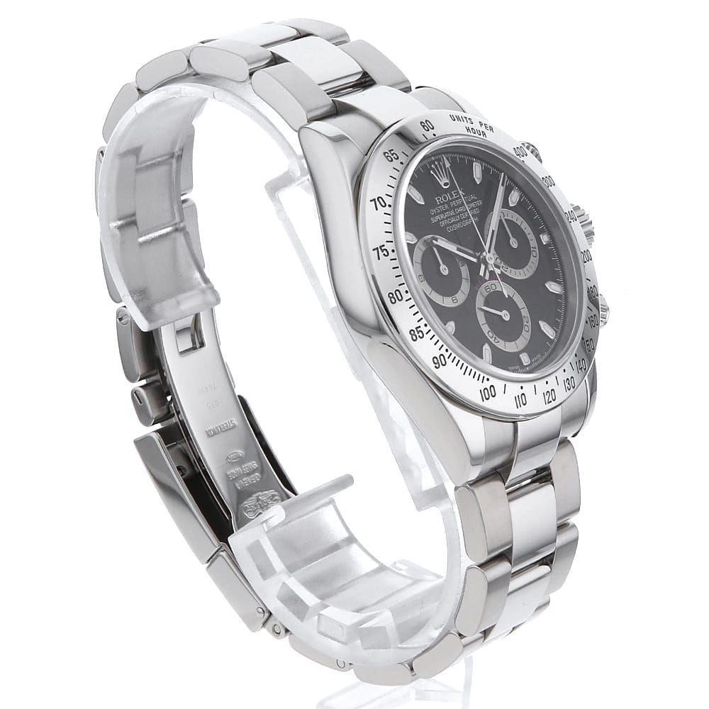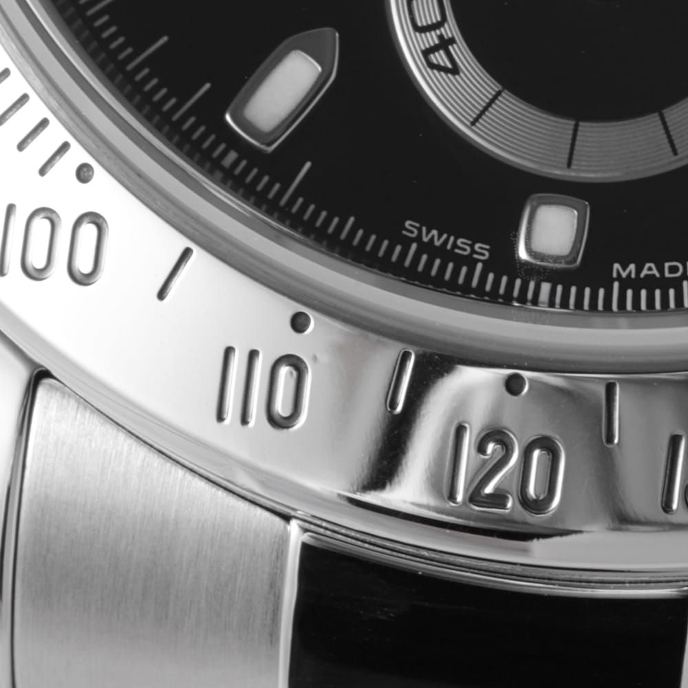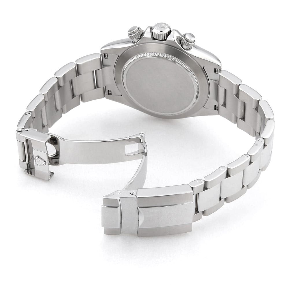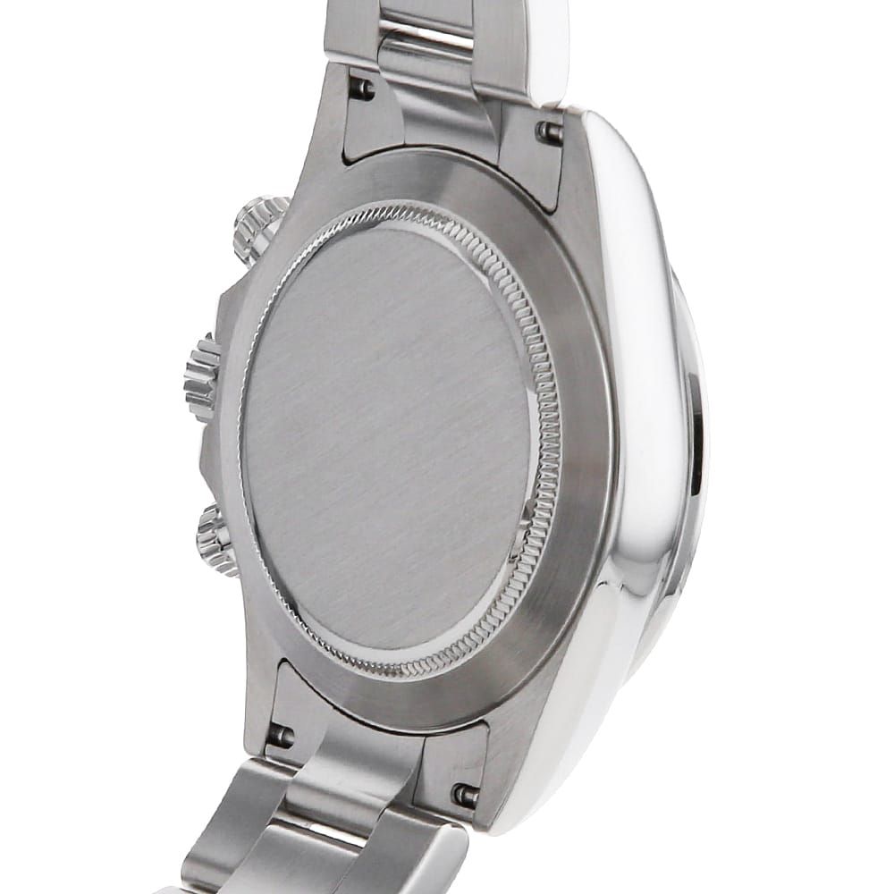 ■モデル情報:生産終了した今なお、時計ファンから熱い支持を得続けるデイトナRef.116520。ロレックス初の完全自社製クロノグラフとなるCal.4130を搭載した、同社にとって意義深いモデルでもあります。さらに、2000年〜2016年の製造期間の中で随所にブラッシュアップが加えられており、高い安定性や耐久性、実用性を獲得しました。ステンレスで形成されたベゼルが精悍な顔立ちで、全体をスタイリッシュに引き締めます。パワーリザーブ約72時間。100m防水。
