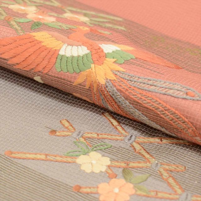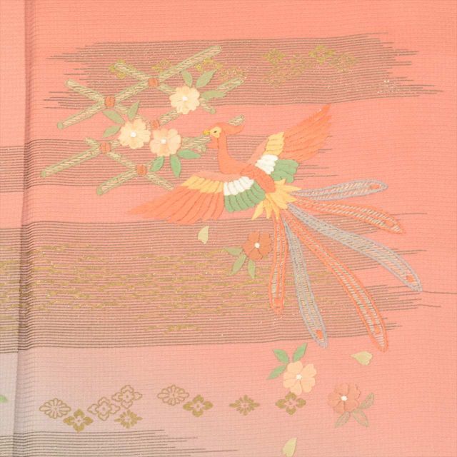 濃いピンク色に霞に鳳凰文様があしらわれ、上品さが感じられるリサイクル付下げ訪問着です。