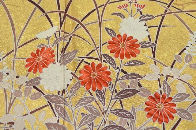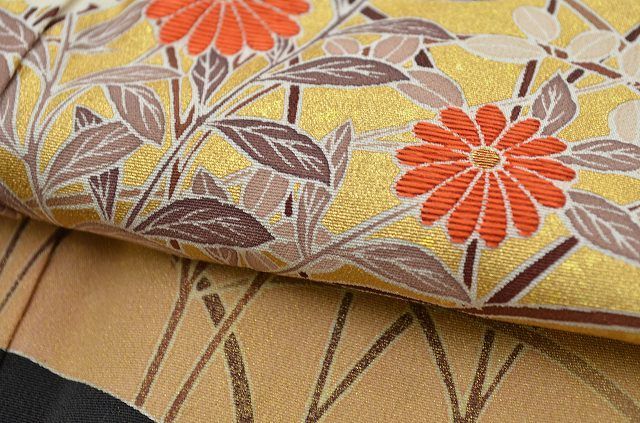 帯は金色地に松や花文様が施された上品な袋帯です。