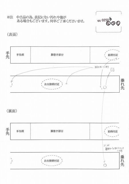 着用時、帯(おはしょり折込)や下前(右前)、衿の折込などで隠れる箇所