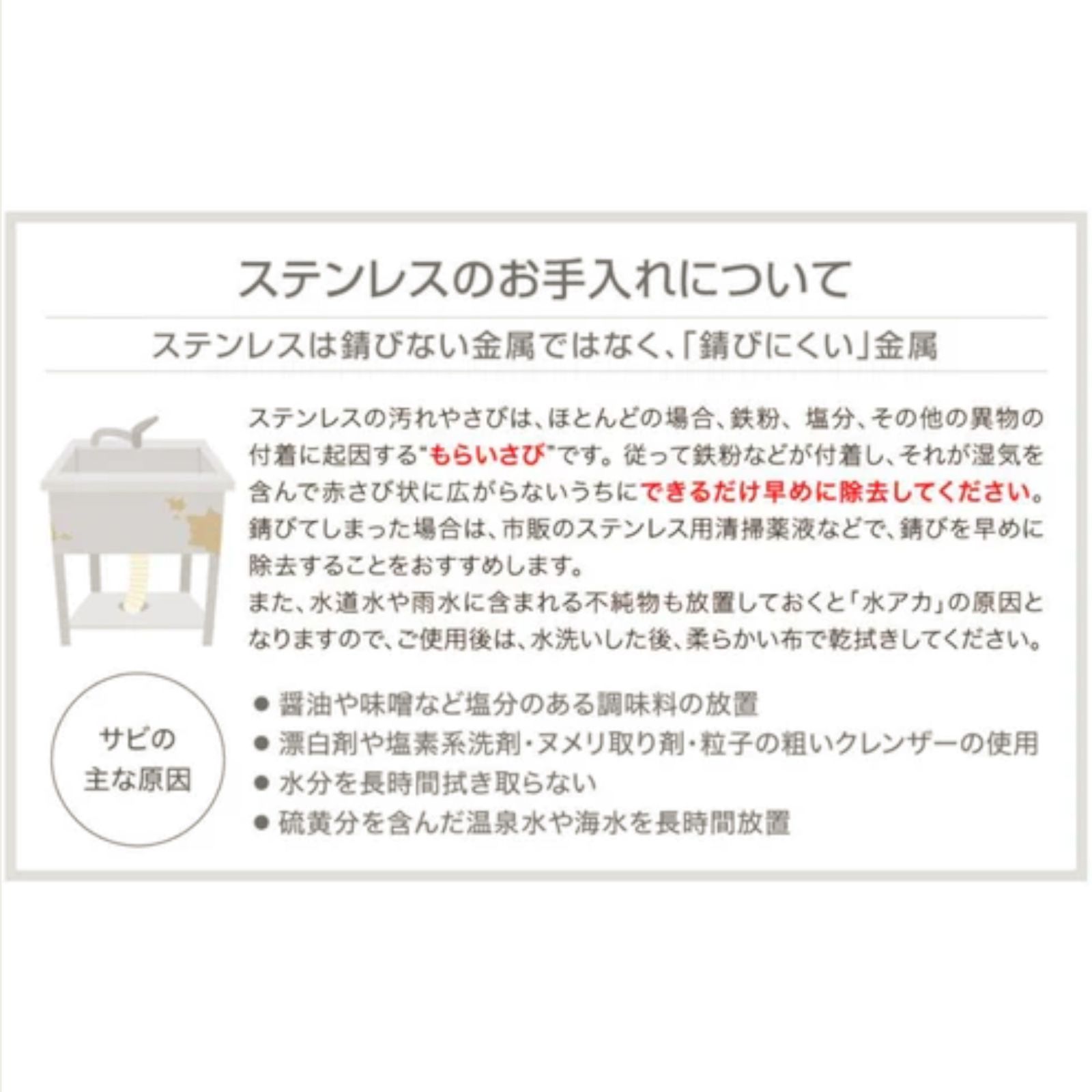 材質はサビやキズに強いステンレス製。雨風にも強く、屋外に設置したままでも安心して使い続けられます。※シンクでの作業終了時には水分や汚れをよく拭き取ってください。清潔な状態を保つことにより、さらにサビの発生を予防することができます。