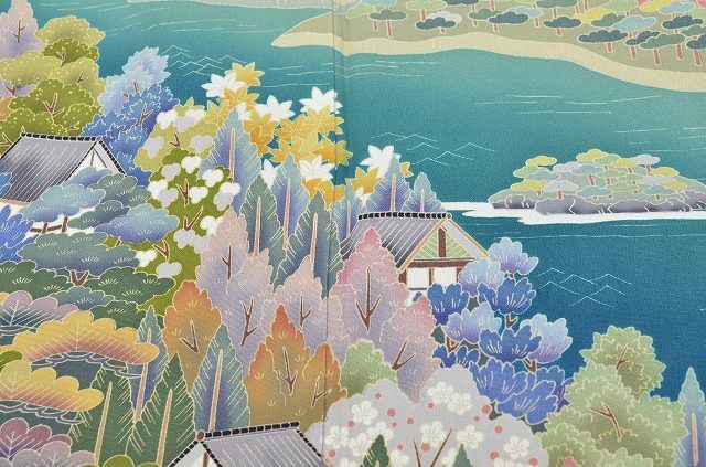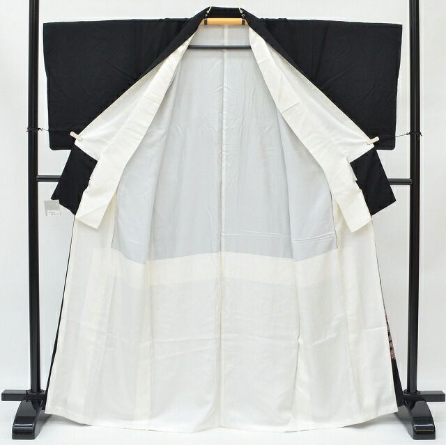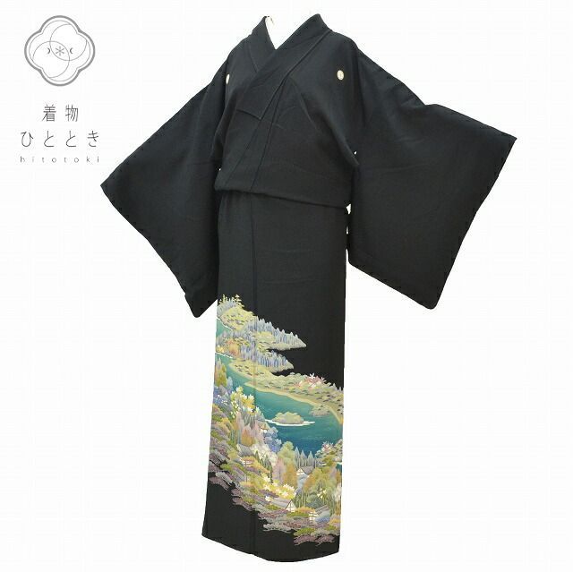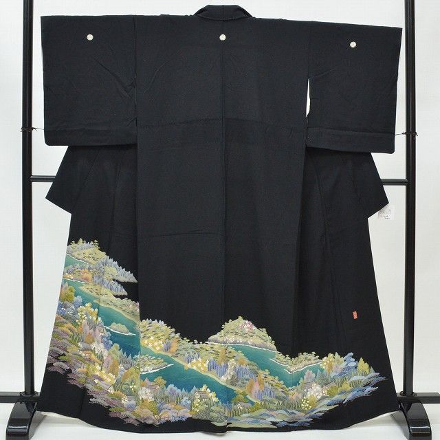 10リサイクル着物黒留袖正絹五つ紋比翼付き仕立て上がり落款有裄67cmL身丈154cmSちょっとふくよかL黒色系風景文様特品★★★★pp1583b