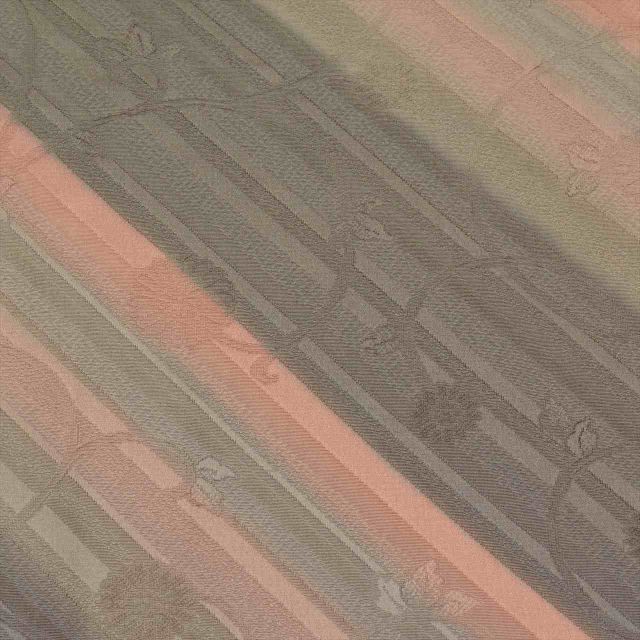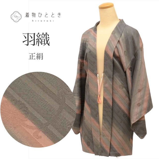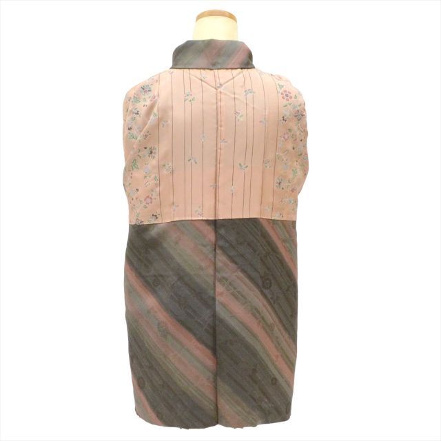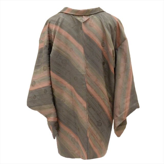 グレーとピンク色に花唐草文様が施されたリサイクル羽織です。