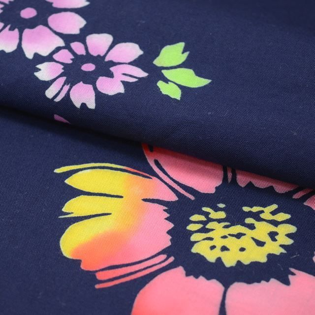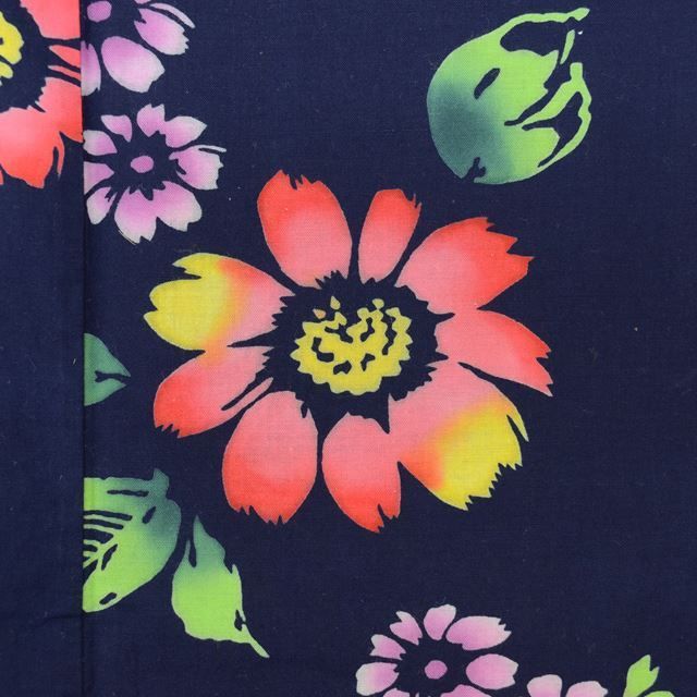 紺色にダリアや桜などの文様が施された可愛らしい女性用のリサイクル浴衣です。