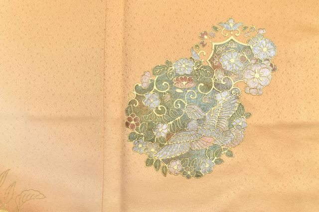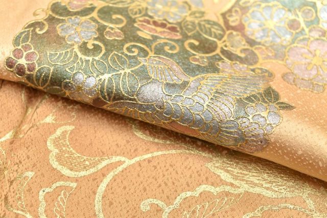 黄土色に鳥や植物文様があしらわれ、上品さが感じられます。