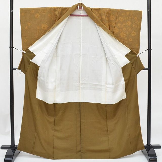 リサイクルしょうざん紬正絹仕立て上がりリサイクル着物リサイクル紬女性ガード加工済裄63cmS身丈157cmM茶色系花文様特品★★★★mm3572b