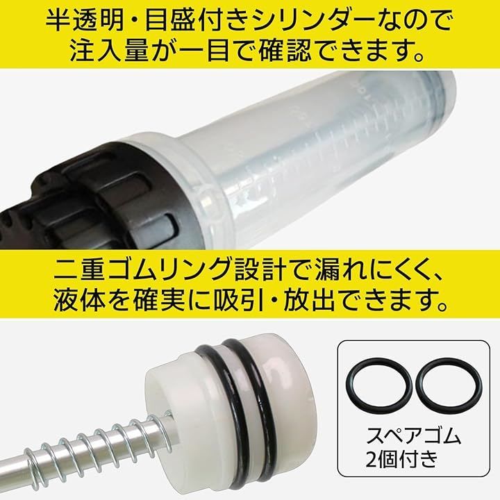 // 抽出量がわかる目盛付き // 透明シリンダーに目盛があり、注入量を目視で確認可能。