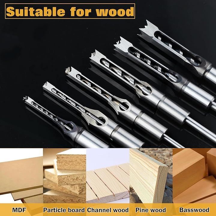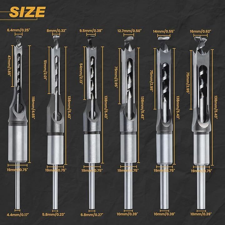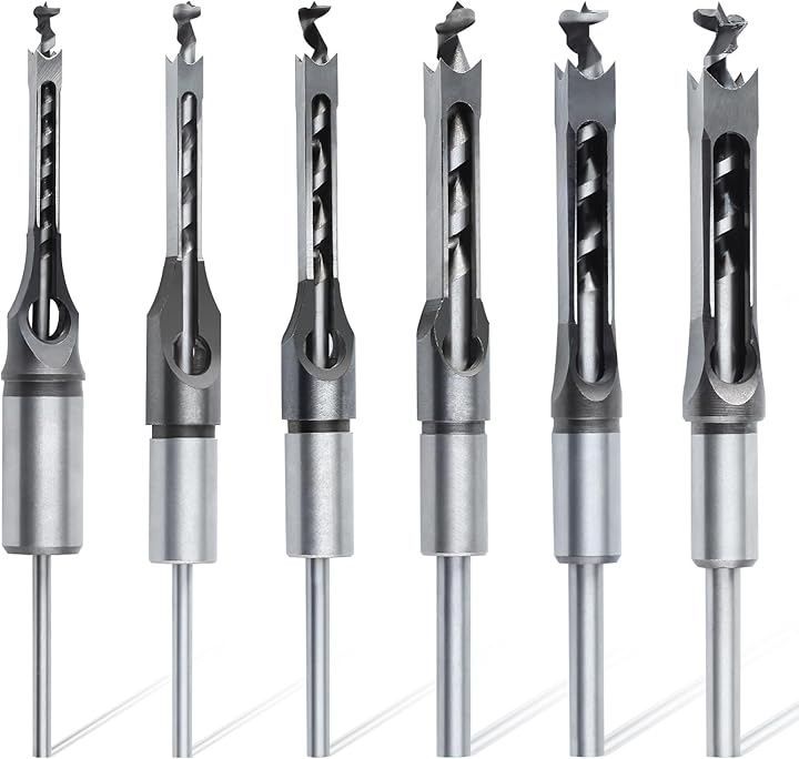 この6本セットには、1/4 から5/8 までのビットが含まれ、木材にさまざまなサイズの角穴をくり抜くことができます。