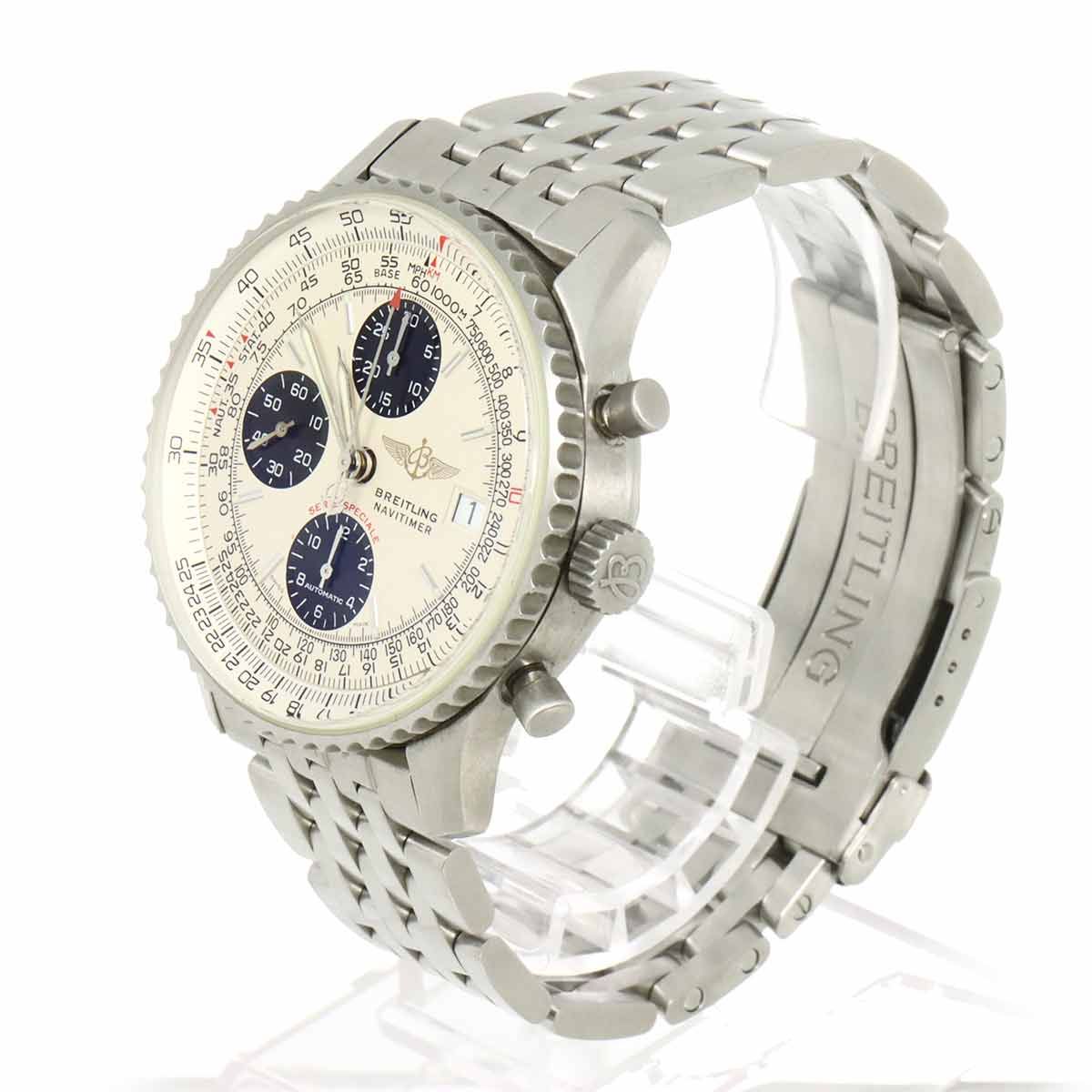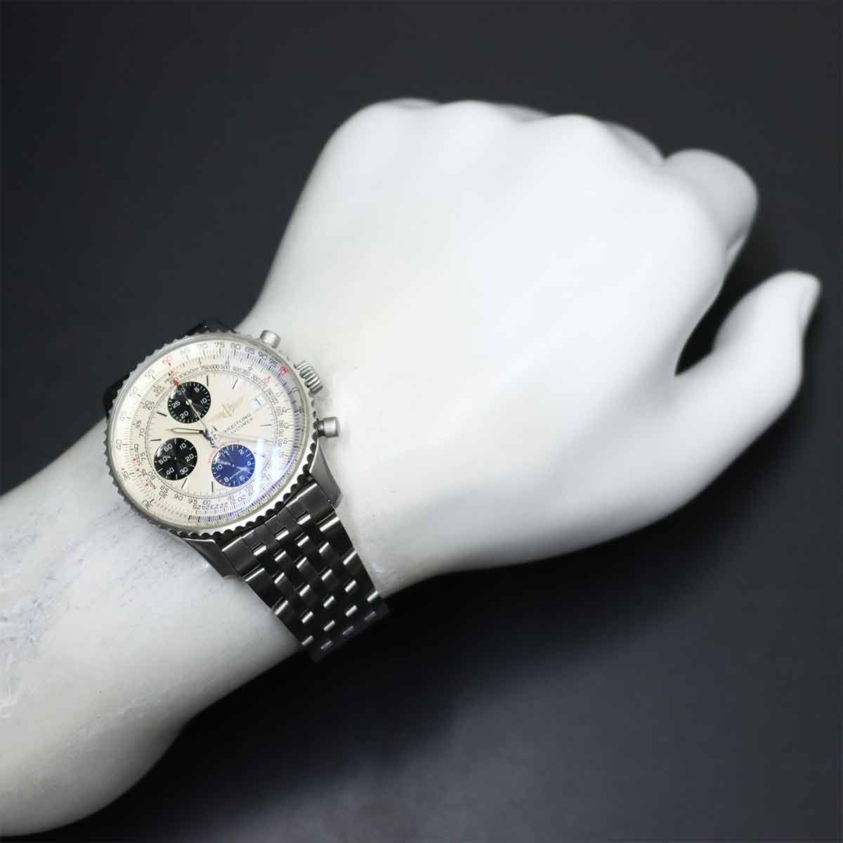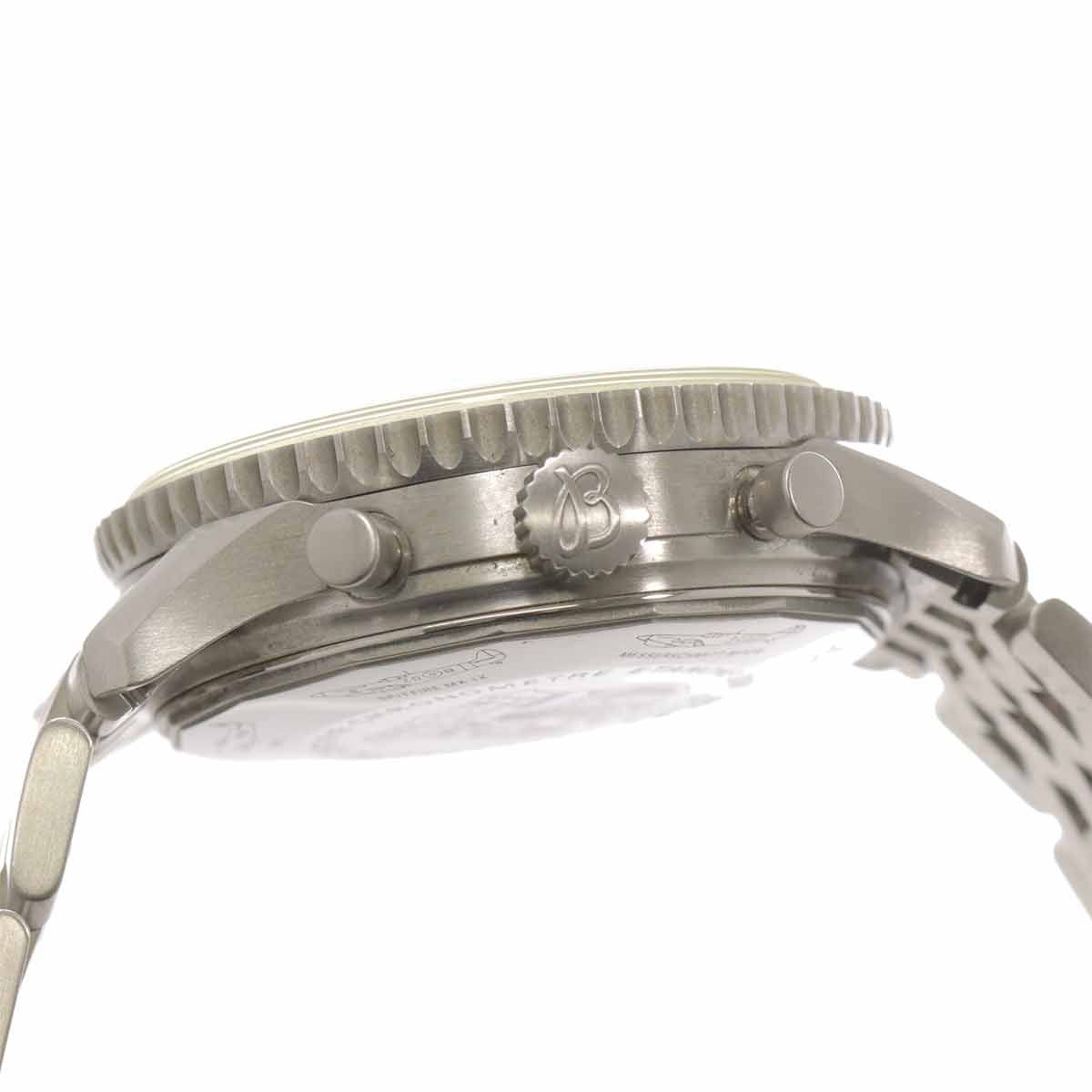 ブライトリングからエアロバティック・チーム「ブライトリング・ファイターズ」に敬意を表して誕生した『ナビタイマー ファイターズ』クロノグラフ腕時計です。裏蓋にはエンブレムと6機のシルエットを刻印!艶消しのケース、ブレスとシルバーのフェイスがクラシックなイメージの逸品です。