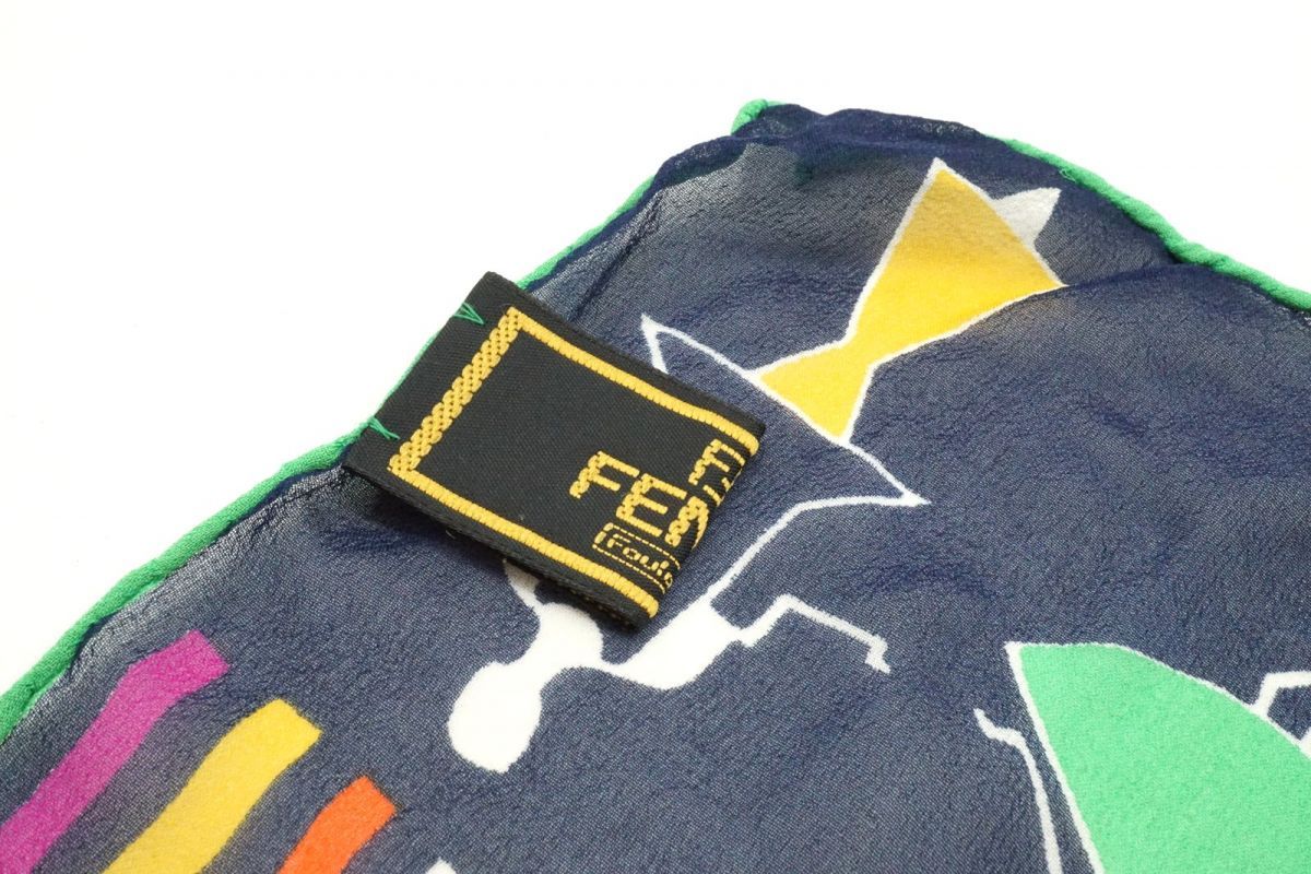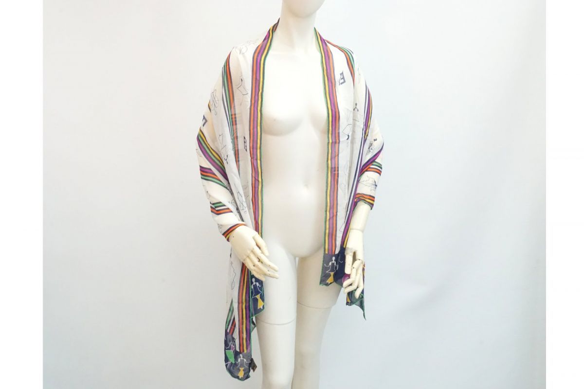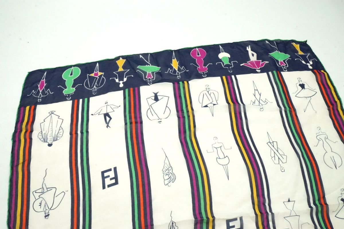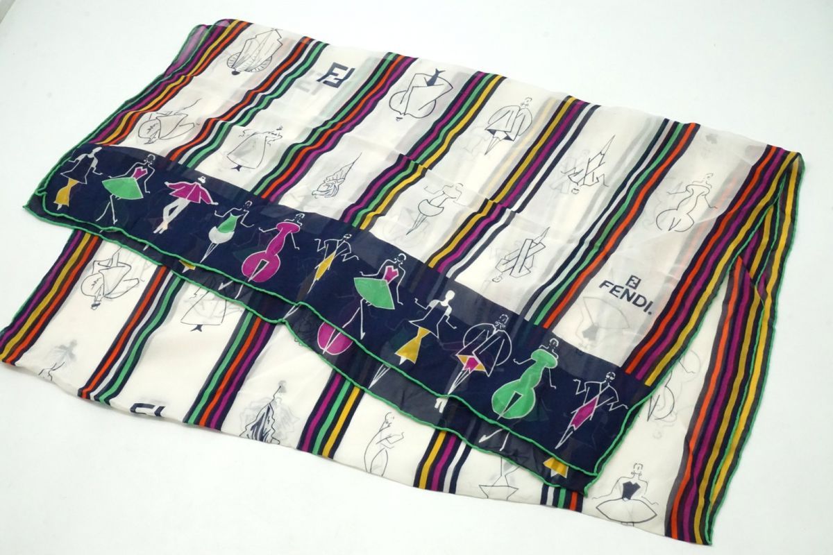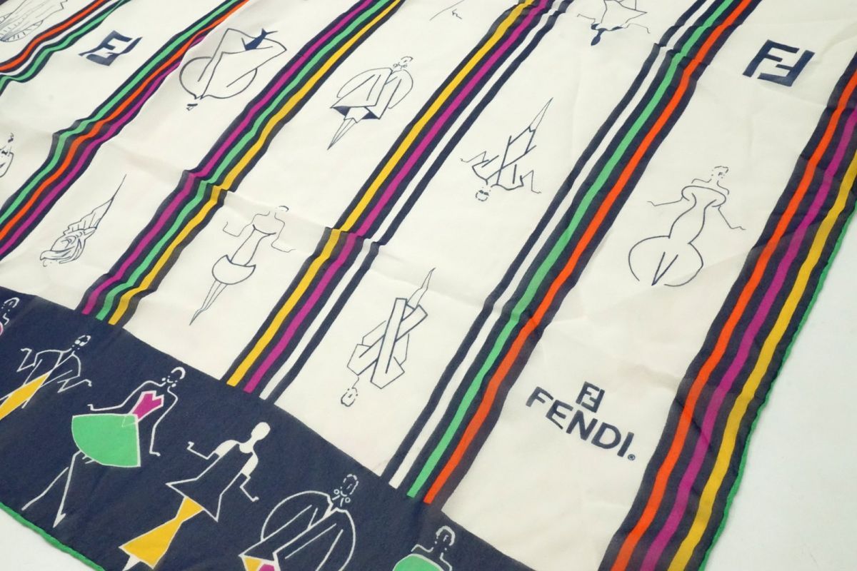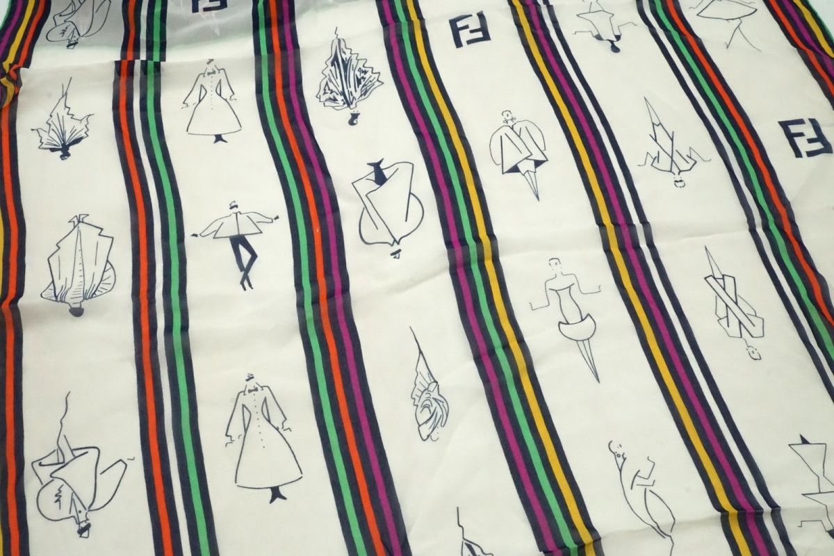 フェンディ ヴィンテージ 62×160 ストール ショール シルク100% デザイン画 ストライプ FFロゴ レトロ 白 ホワイト FENDI 4869k