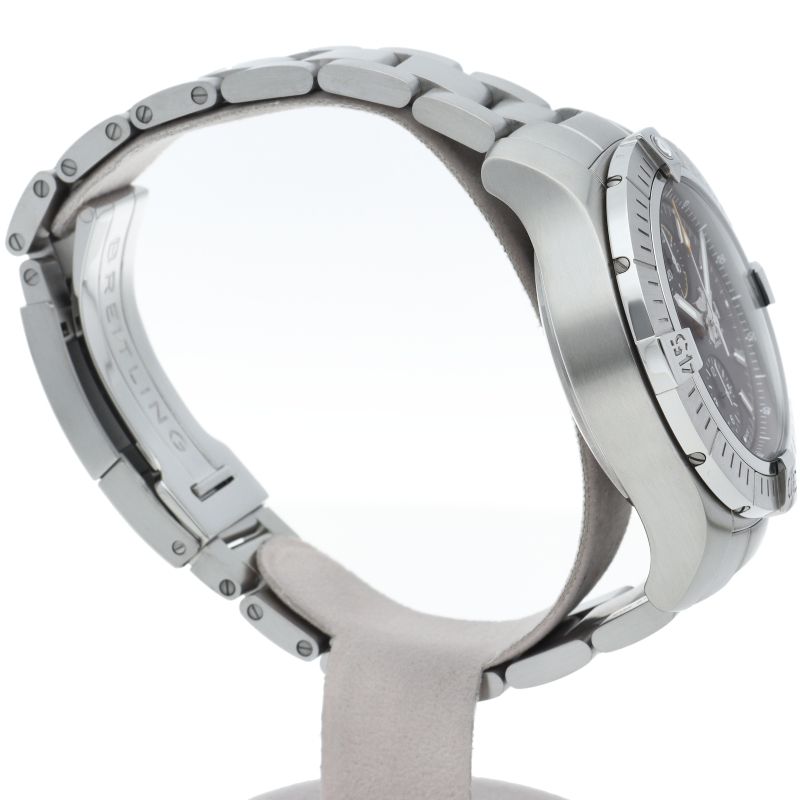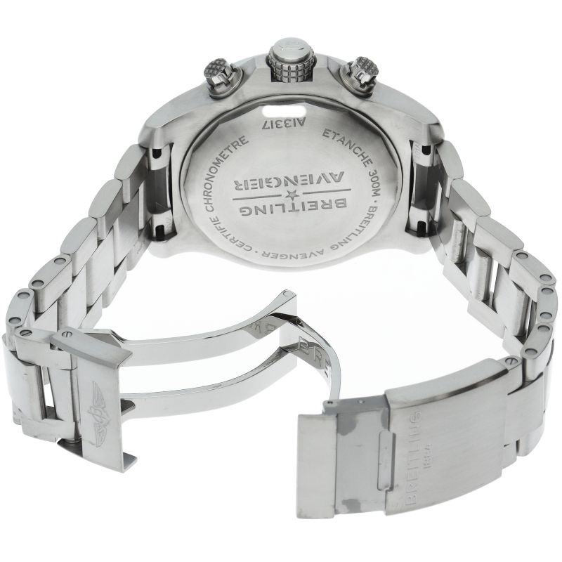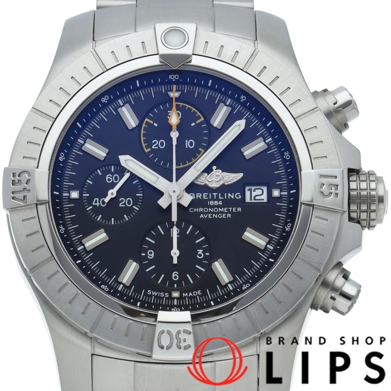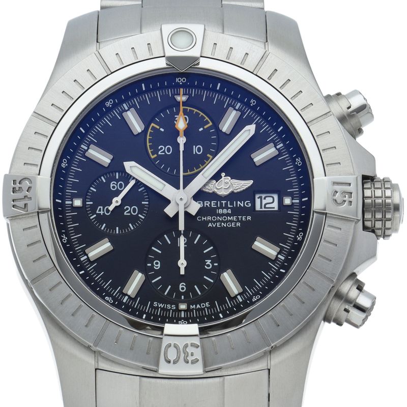 商品説明:大胆な外観に頑強かつ優れた耐衝撃性を備えたアベンジャー クロノグラフ 45のステンレススチール製ケースは逆回転防止機能付きラチェット式ベゼルを装備、ダイヤルはブラックまたはブルーをご用意しました。ムーブメントは自動巻きのブライトリング キャリバー13を搭載。A13317/A13317101B1A1