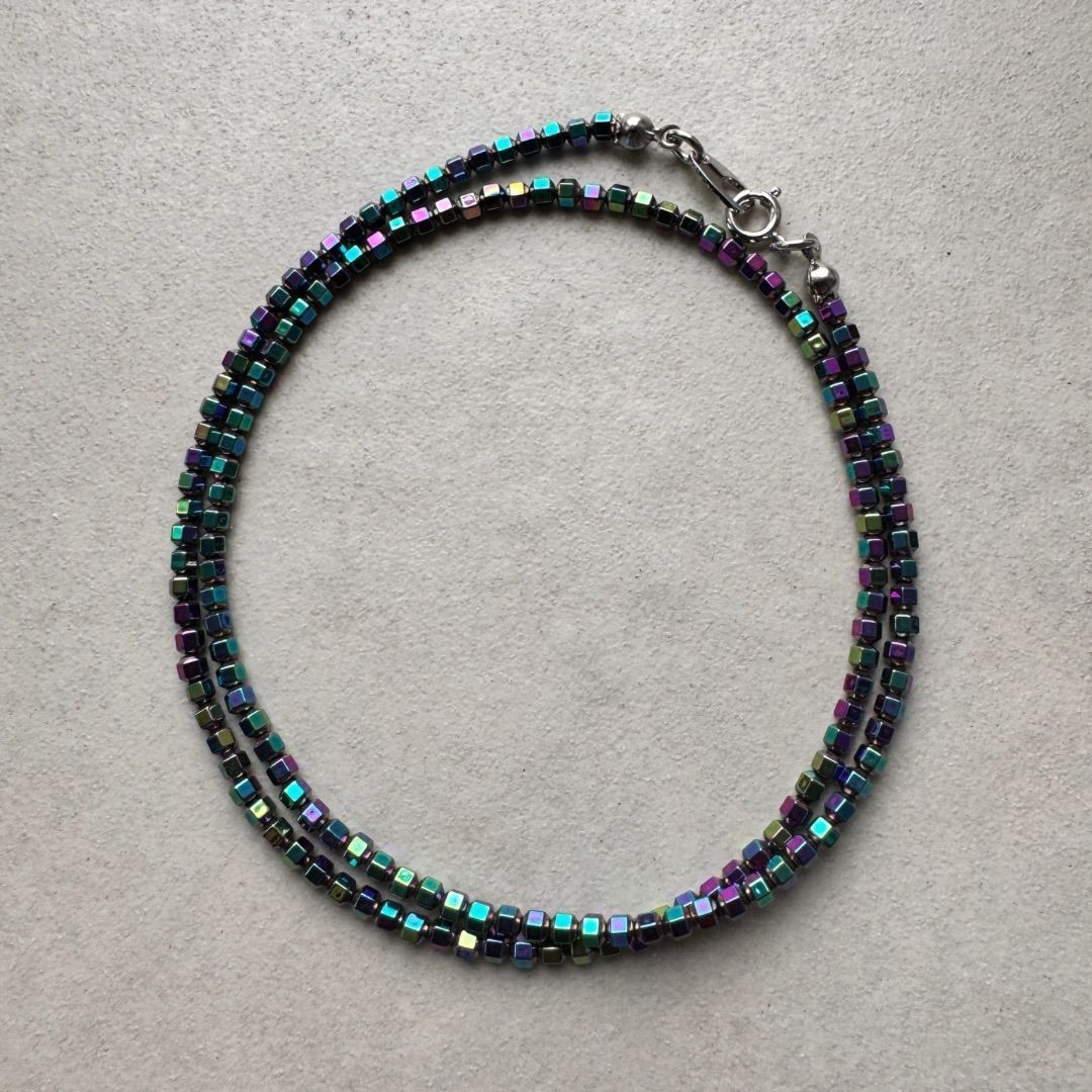 ヘキサゴン(六角形)型に形成したレインボーヘマタイトを使用したビーズネックレス 。