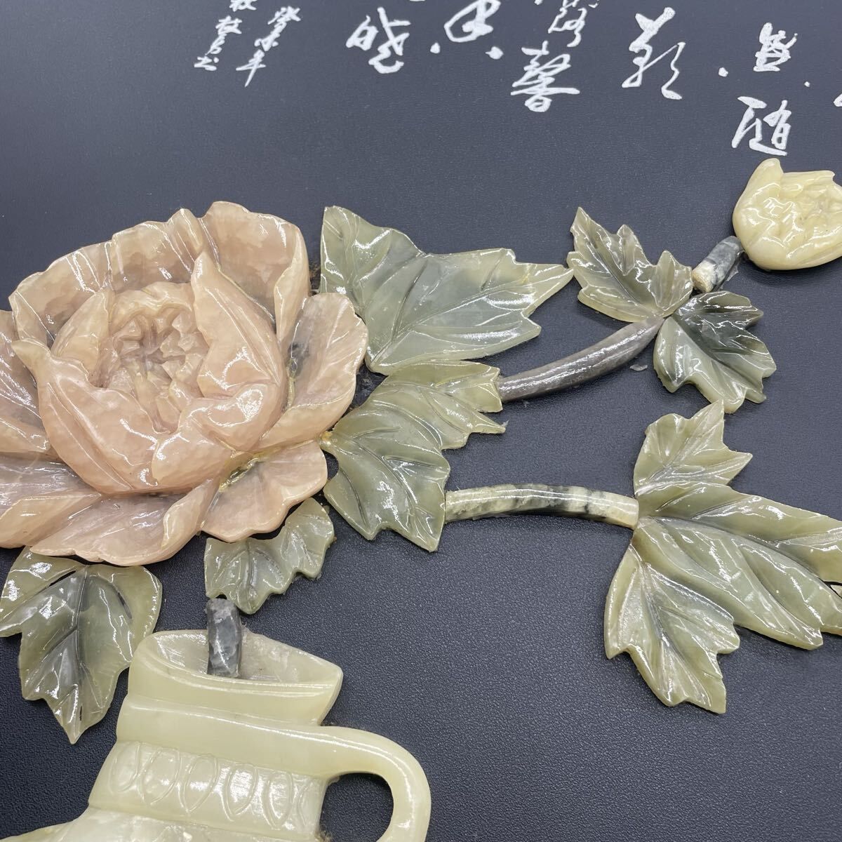 優しい色味の翡翠を使用した彫刻パーツが、黒地のパネルに映える上品な壁掛け装飾です。